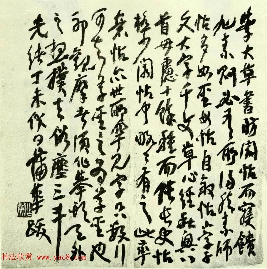 釋文:學大草書昉閣帖而寢饋旭素則必有所得然素師帖多如聖母帖自敘帖小字千文大字千文草心經秋興八首毋慮十餘種而張長史極少閣帖中略略有之此率意帖世所罕見字隻數行可知草聖之為草聖也耶觀摩者須作舉頭天外之想撲去俗塵三鬥 光緒丁未伏日蒲華跋。