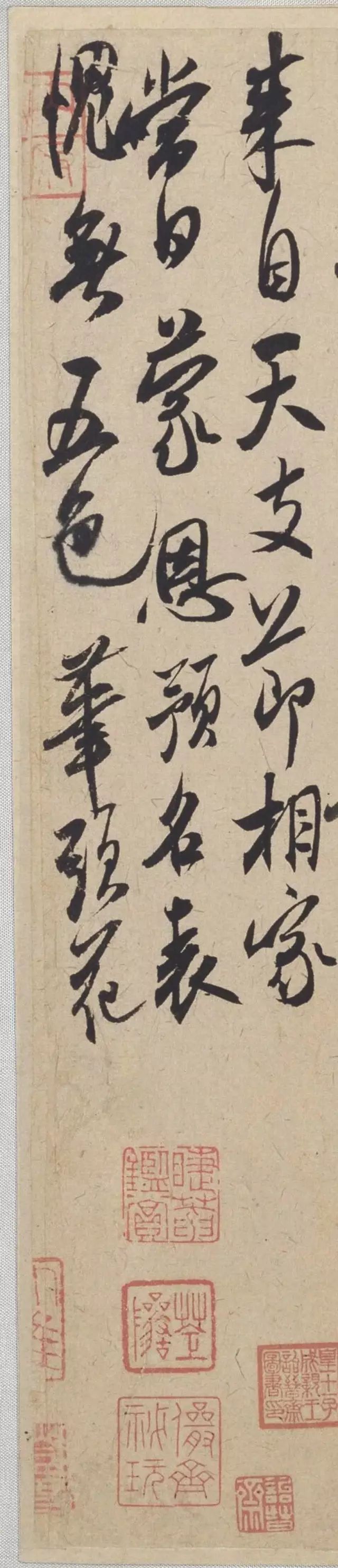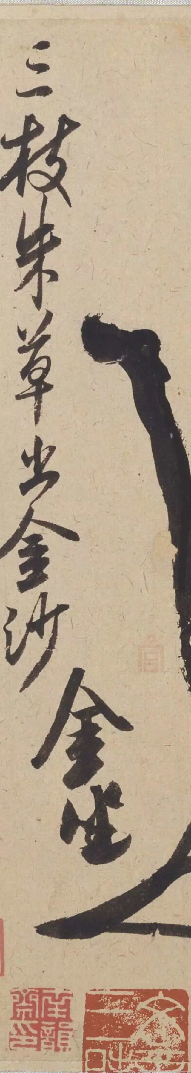 第三部分,畫之不足,又為珊瑚筆架題詩一首:“三枝朱草出金沙,來自天支節相家。當日蒙恩預名表,愧無五色筆頭花。”頭一句狀物,第二句道其來曆。“天支”即皇族。“節相”乃是“節度使”與“使相”二職的合稱,指在中央掛有相當於宰相職銜的地方節度使,屬於位高權重者流。大宅門舊藏的珊瑚筆架,品位自是超群。因此米芾在三、四兩句詩中自愧乏才,拙筆配不上如此珍品。“名表郎官”是宋代禮部郎中的別稱,米芾曾膺此職,參與朝廷文秘工作,故曰“當日蒙恩預名表”。“五色筆頭花”用南朝江淹“夢筆生花”典故,指傑出的文才。作者的“自謙”手法,更加突出了珊瑚筆架的高貴。