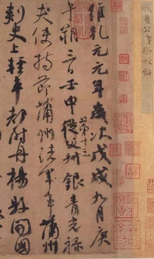 釋文:維乾元元年。歲次戊戌。九月。庚午朔。三日壬申。第十三(從父塗去)。叔銀青光祿(脫大字)夫使持節蒲州諸軍事。蒲州刺史。上輕車都尉。丹陽縣開國侯真卿。以清酌庶羞。祭於亡姪贈讚善大夫季明之靈曰。惟爾挺生。夙標幼德。宗廟瑚璉。階庭蘭玉。(方憑積善塗去)。每慰人心。方期戩穀。何圖逆賊開釁。稱兵犯順。爾父竭誠。(□製塗去改被脅再塗去)。常山作郡。餘時受命。亦在平原。仁兄愛我。(恐塗去)。俾爾傳言。爾既歸止。爰開土門。土門既開。凶威大蹙。(賊臣擁眾不救塗去)。賊臣不(擁塗去)救。孤城圍逼。父(擒塗去)。陷子死。巢傾卵覆。天不悔禍。誰為荼毒。念爾遘殘。百身何贖。嗚乎哀哉。吾承天澤。移牧河關。(河東近塗去)。泉明(爾之塗去)比者。再陷常山。(提塗去)。攜爾首櫬。及茲同還。(亦自常山塗去)。撫念摧切。震悼心顏。方俟遠日。(塗去二字不辨)。卜(再塗去一字不可辨)。爾幽宅。(撫塗去)。魂而有知。無嗟久客。嗚呼哀哉尚饗。