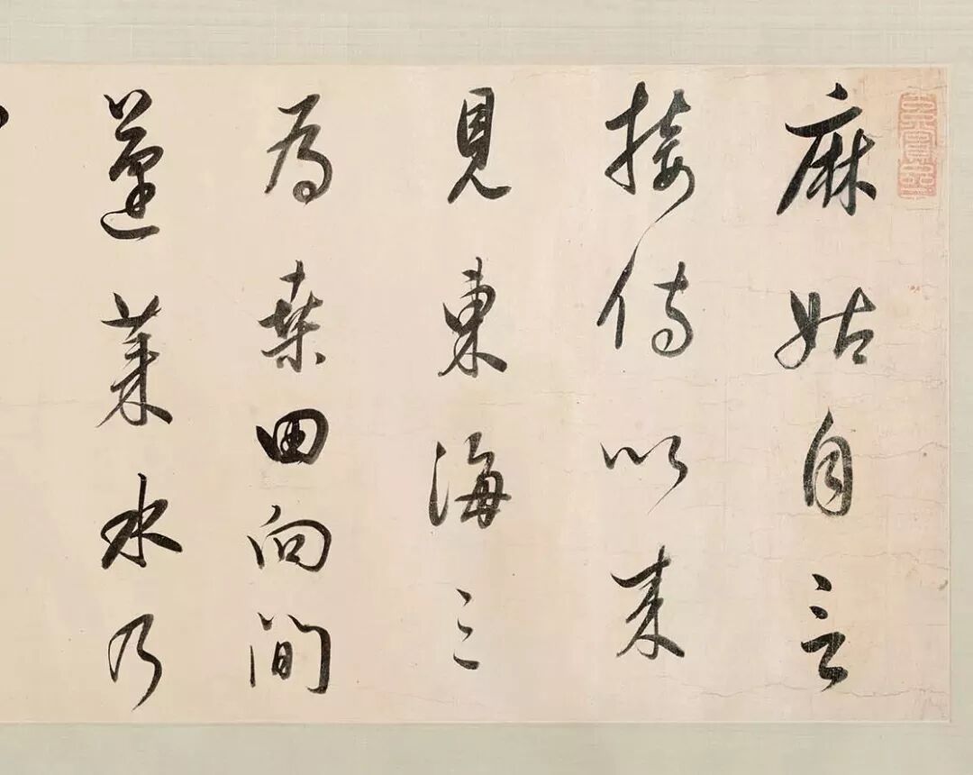 此卷前段是陳繼儒畫《霧村圖》,用“米氏雲山”畫法,繪江南山水蔥鬱、煙嵐縹緲之貌;後段董其昌節錄顏真卿《麻姑仙壇記》,大字行草,書風以閣帖為主,略帶米芾意趣。後人感其友誼,而合為一卷。兩人交情正如陳繼儒所言“少而執手,長而隨肩,涵蓋相合,磁石相連,八十餘載,毫無間言”。