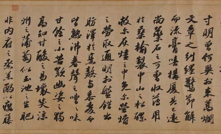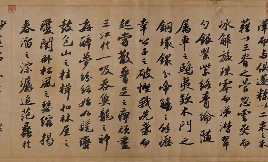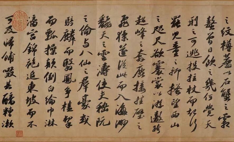 蘇軾的行、楷書得力於王羲之、李邕、顏真卿和楊凝式,為“宋四家”之首。此卷是他59歲(1094)貶謫嶺南途中,為讚“洞庭春色”和“中山鬆醪”兩種名酒所作長賦,文章豪放暢達,書法沉雄勁健,堪稱雙絕。至明代備受李東陽、詹景鳳、王世貞等人讚美,曾為董其昌好友陳永年寶藏。董其昌極為推崇蘇軾,本卷雖沒有他的題跋,但應熟知並鑒賞。
