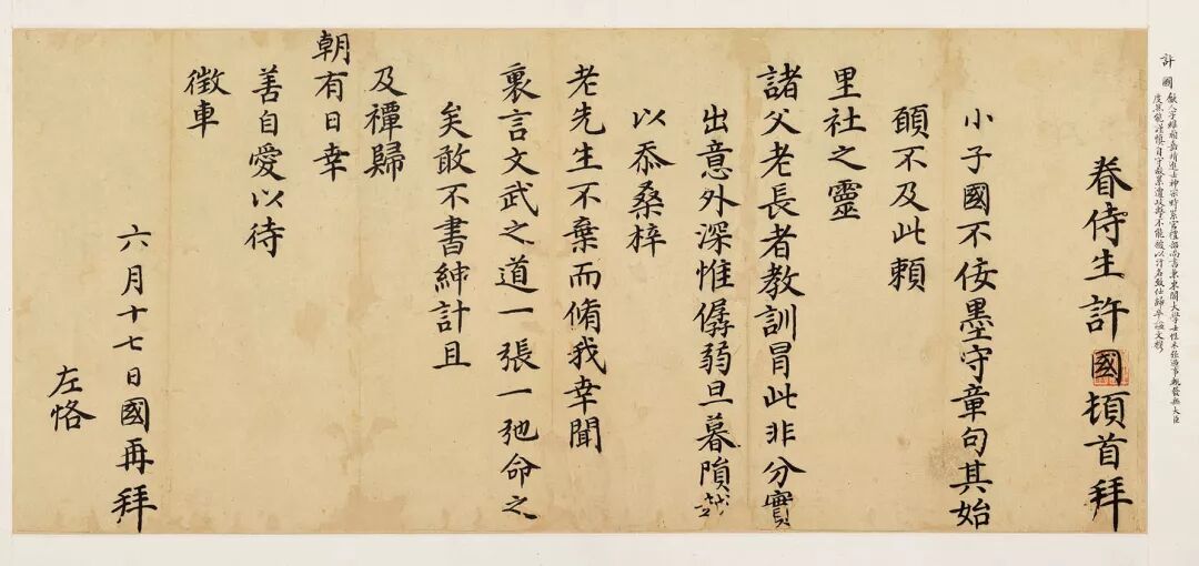 許國(1527-1596),字維楨,安徽歙縣人,官至吏部尚書、建極殿大學士。董其昌萬曆十七年(1589)中進士,許國即為主考官,故董氏尊其為老師,並終生執弟子禮。1591年臘月除夕前五日,董其昌送許國回新安。許氏七十壽辰,董氏賦詩以賀之。許去世後,董氏仍時常往新安吊念恩師,其晚年書《自作太傅許文穆公墓祠記》,對恩師滿懷感激。