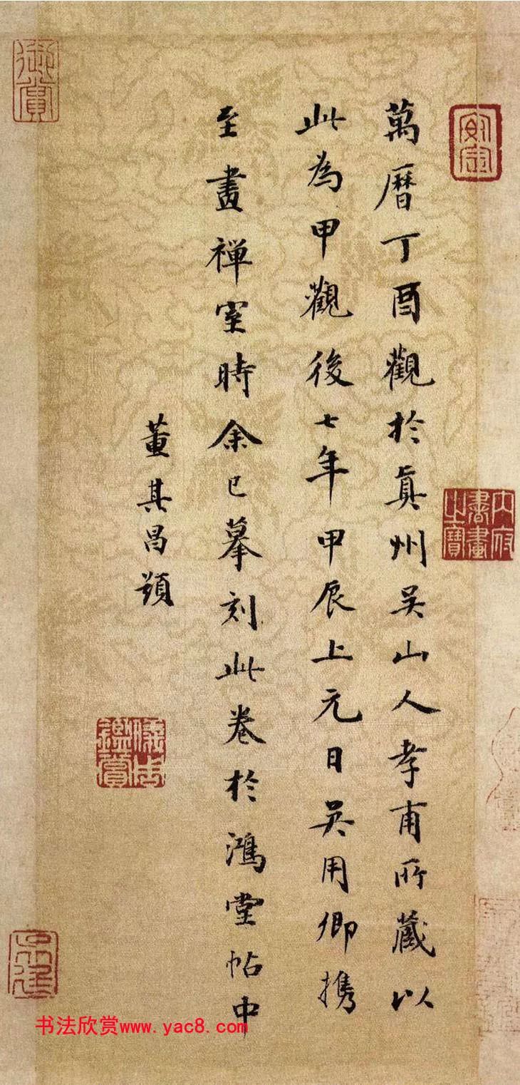 釋文:萬曆丁酉觀於真州吳山人孝甫所藏,以此為甲觀,後七年甲辰上元日,吳用卿攜至畫禪室,時餘已摹刻此卷於《鴻堂帖》中。董其昌題。