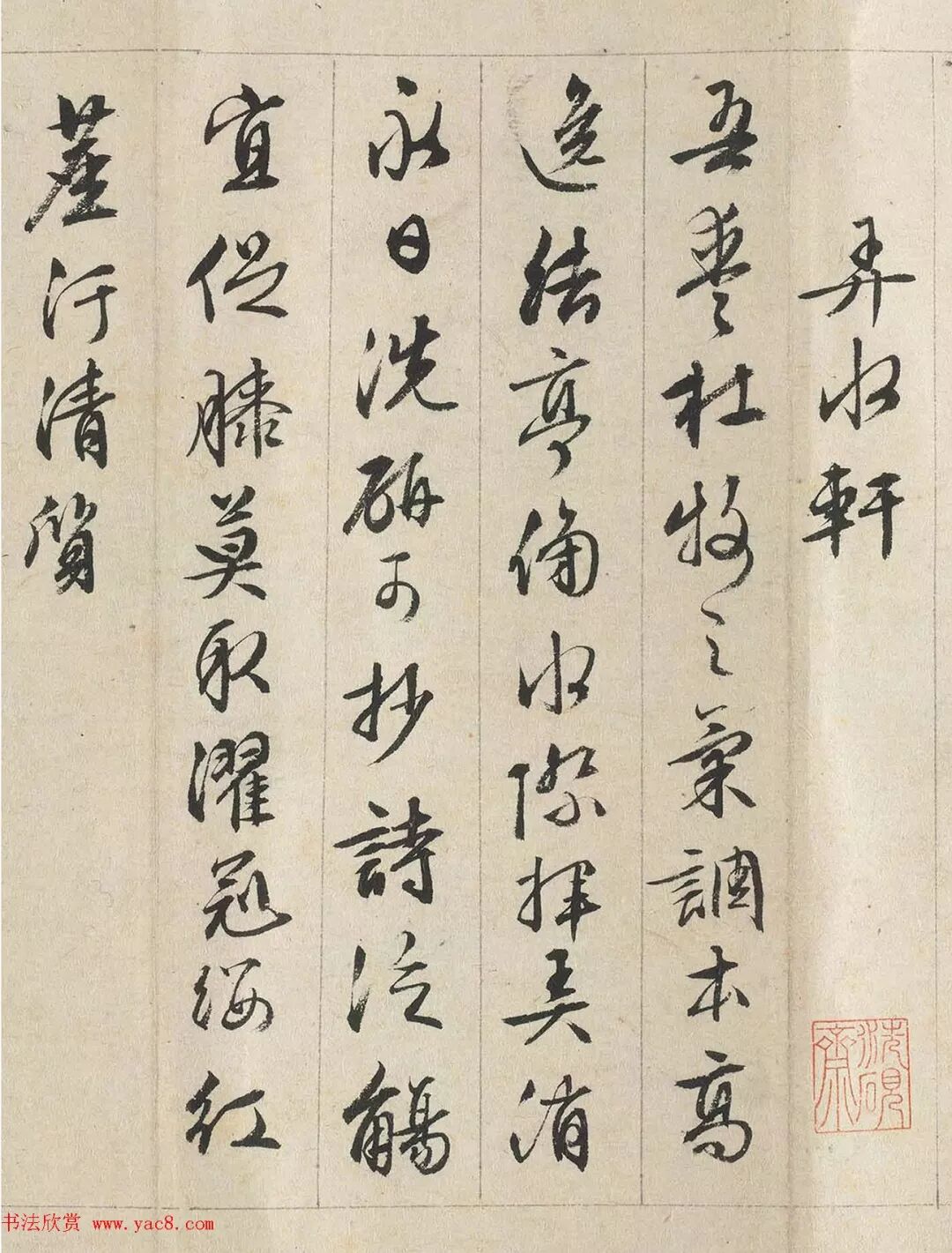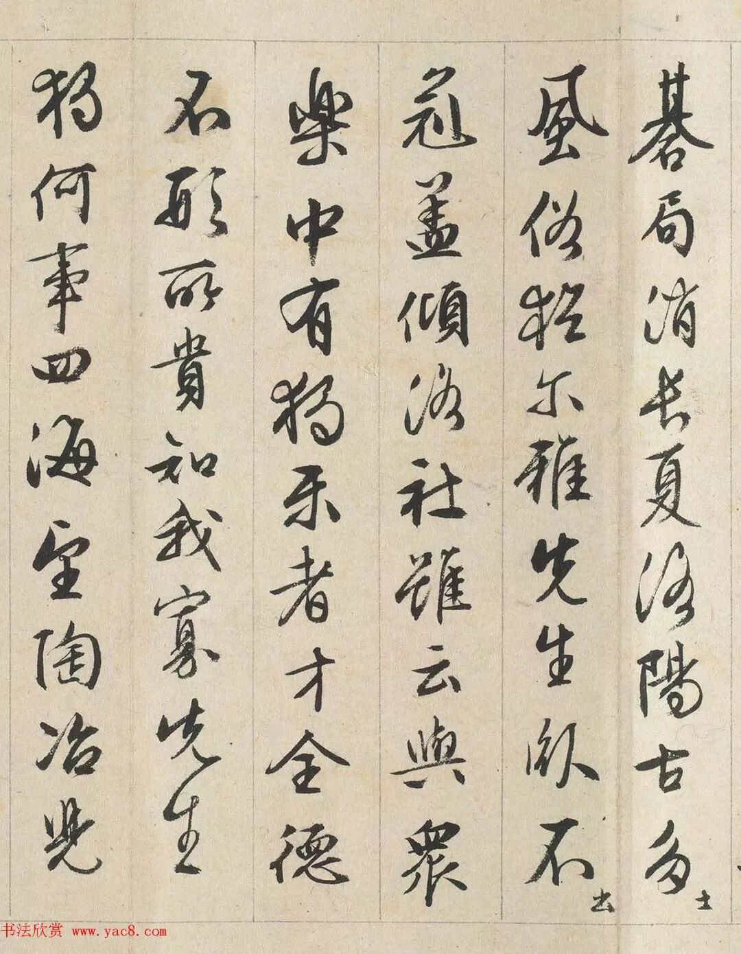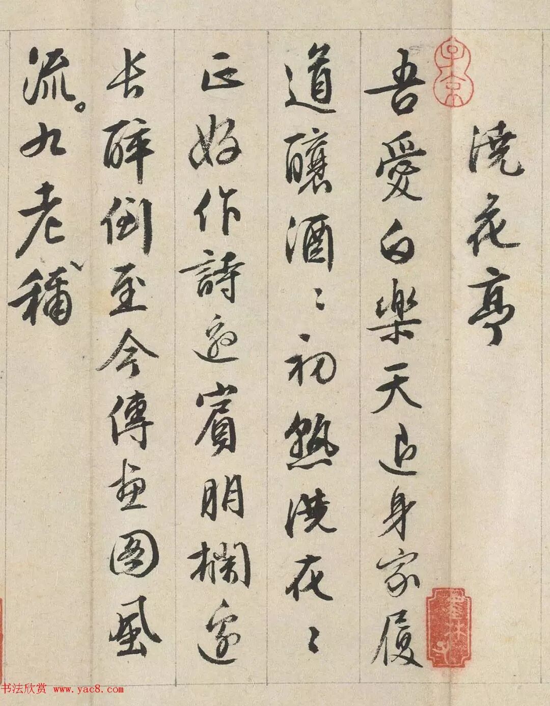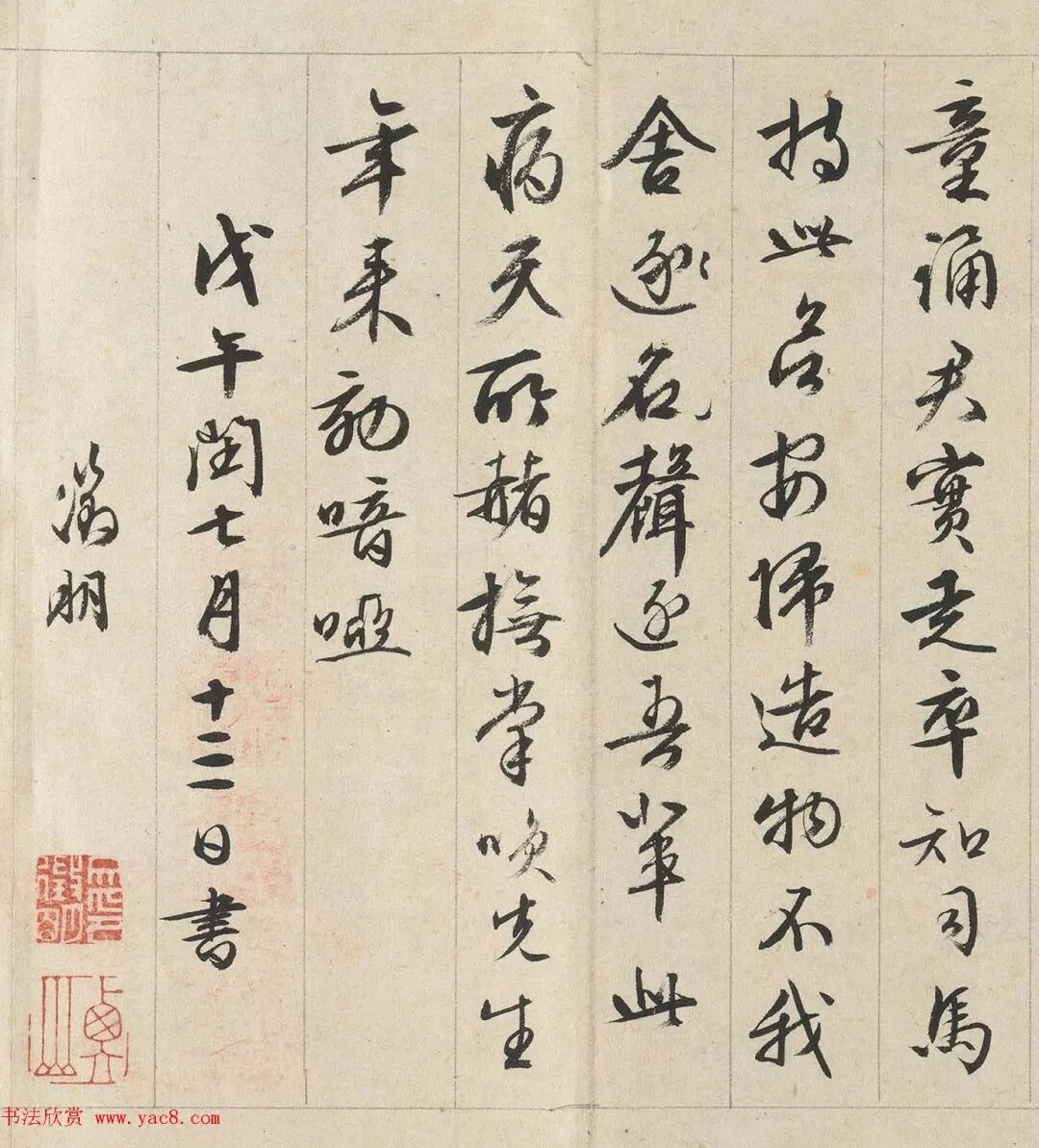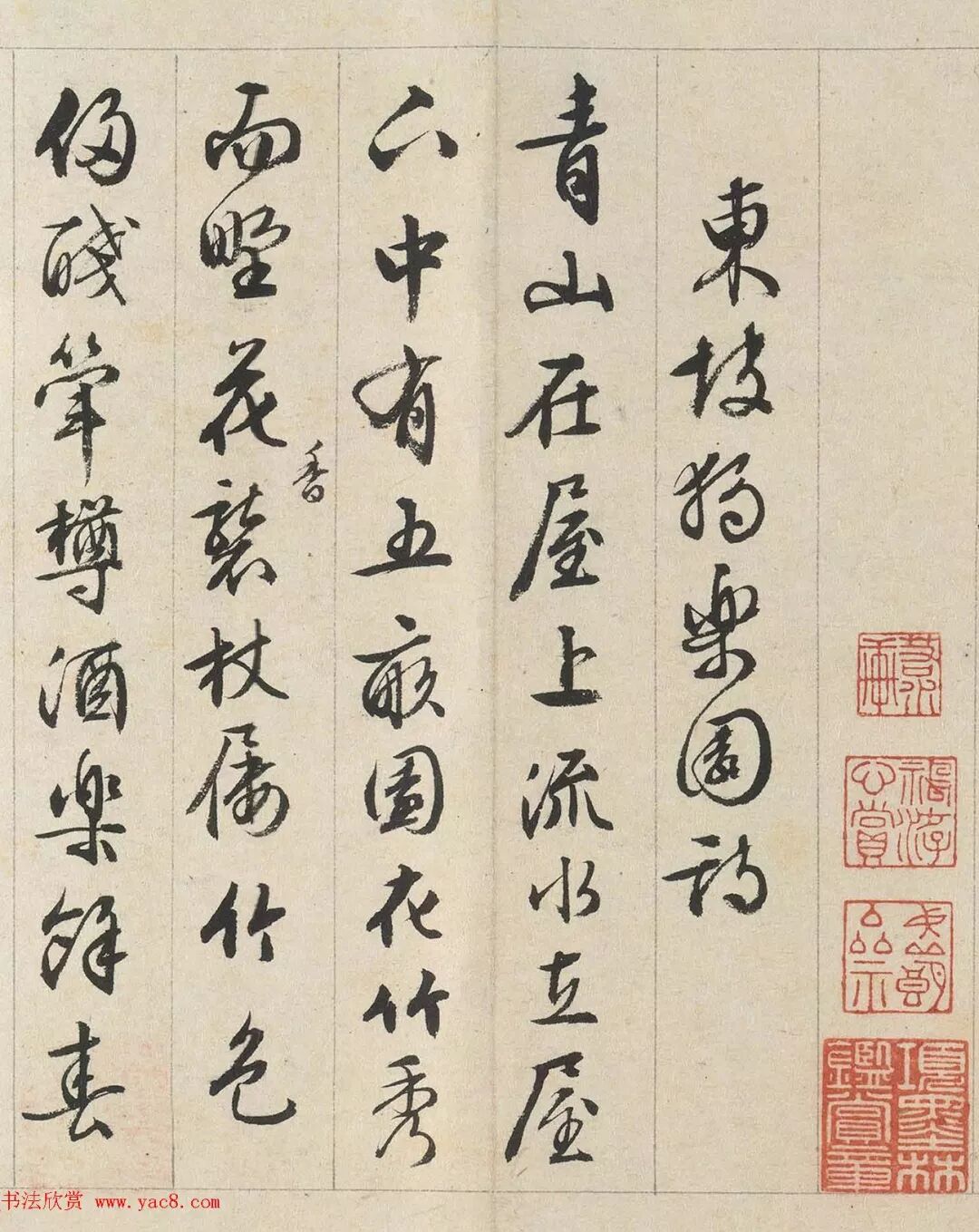 青山在屋上,流水在屋下。中有五畝園,花竹秀而野。花香襲杖屨,竹色侵盞斝。樽酒樂餘春,棋局消長夏。洛陽古多士,風俗猶爾雅。先生臥不出,冠蓋傾洛社。雖雲與眾樂,中有獨樂者。才全德不形,所貴知我寡。先生獨何事,四海望陶冶。兒童誦君實,走卒知司馬。持此欲安歸,造物不我舍。名聲逐吾輩,此病天所赭。撫掌笑先生,年來效喑啞。戊午閏七月十三日書,徵明。