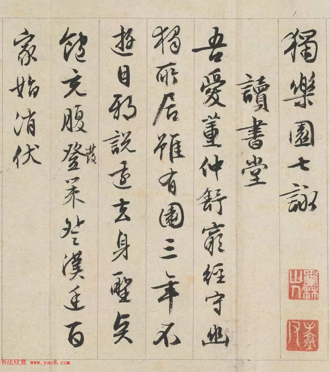文徵明行書《獨樂園七詠》、蘇東坡《獨樂園詩》,來源:明代仇英繪《獨樂園圖》卷後拖尾,此卷曆經明項元汴、清翁同龢遞藏,現藏於美國克利夫蘭藝術博物館。