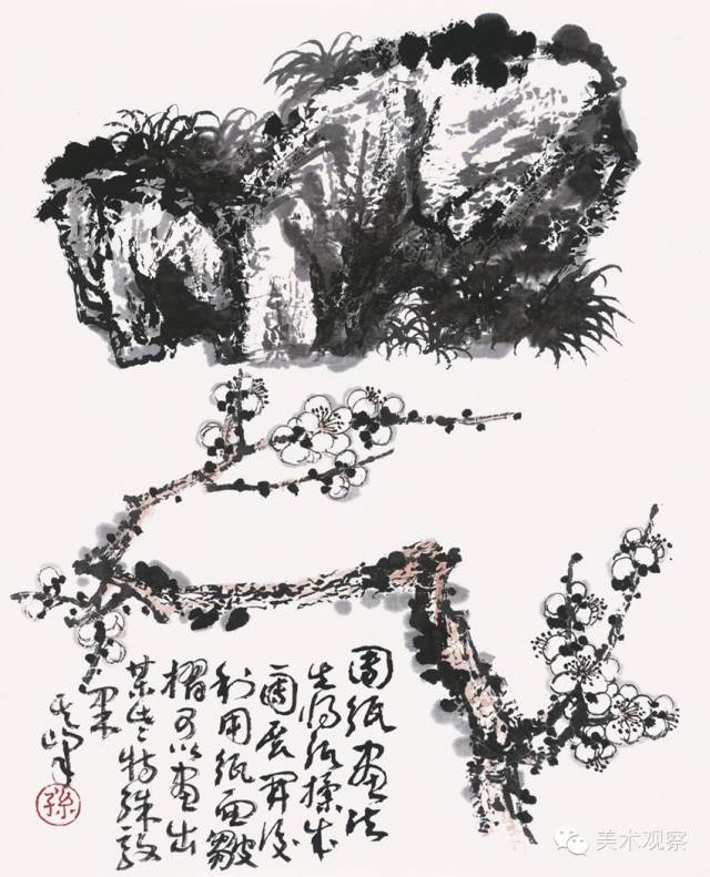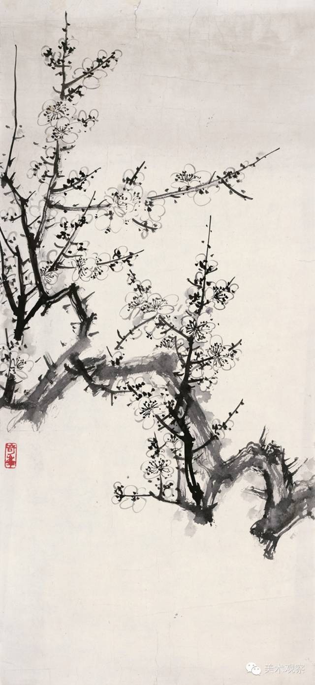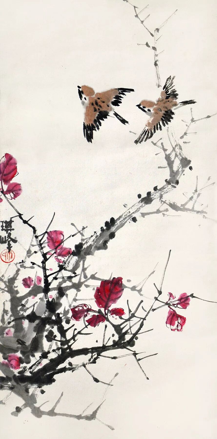 從這幅畫作上看,他的花鳥畫風,既有小寫意的斟酌物象、形神兼備、自然生動、筆法靈活的特點,又在花枝方麵,兼有大寫意注重書寫、運筆疏朗、簡略拙厚、緣物寄性的特色,即所謂形、意、神兼得。在構圖上以對角的方式展現在紙麵上,作品左下角濃淡墨兼施,拉開樹枝遠近的對比。最遠處的樹枝輕描淡寫,以兩隻相互追逐的麻雀點綴畫麵,讓平靜的紙麵多了幾份生氣。尤其在刻畫鳥的神態上,孫其峰注重鳥兒高飛的動作,一前一後,一上一下,節奏頓挫有致。這種細微的動作隻有認真觀察大自然,親近大自然,注重對生活的寫生才能筆下生花。(曹新剛)