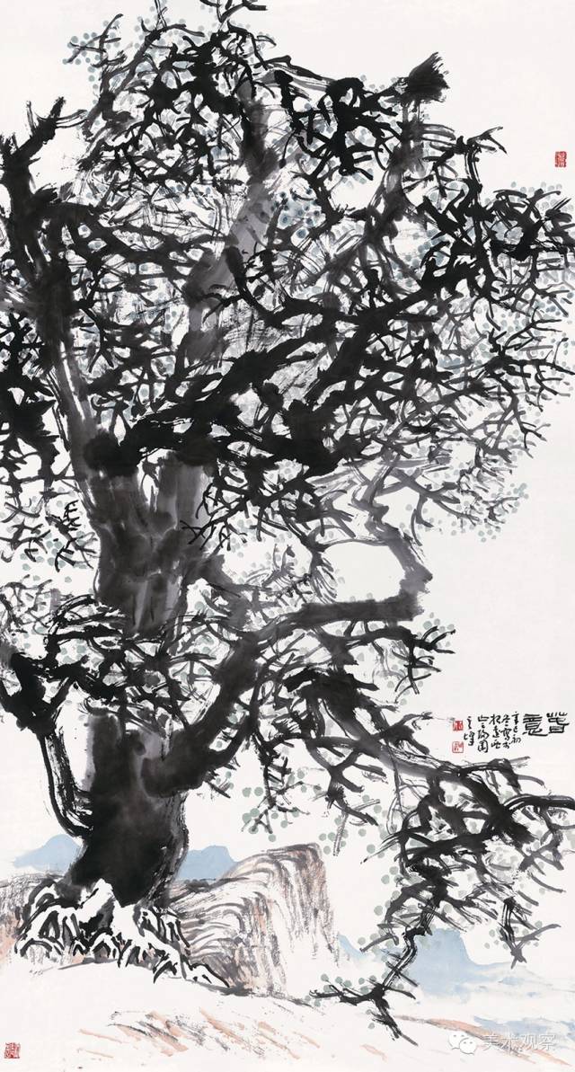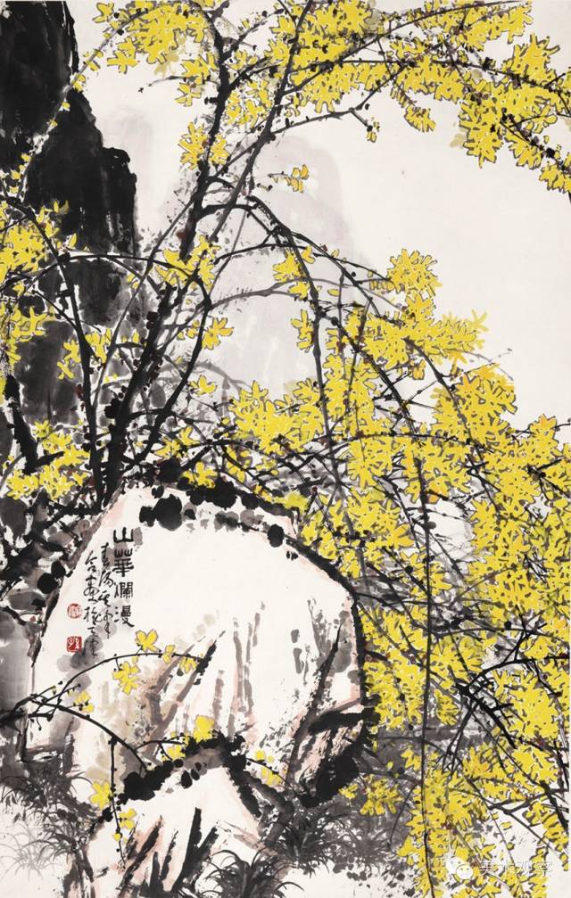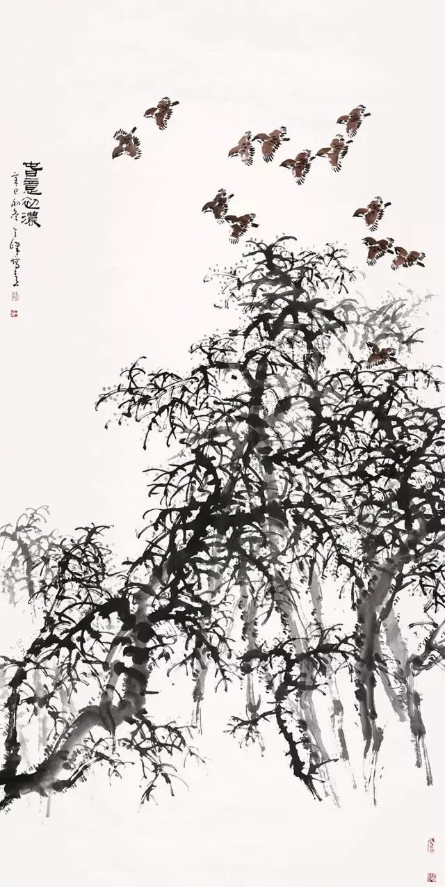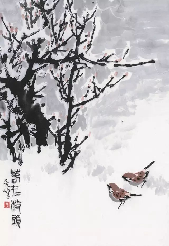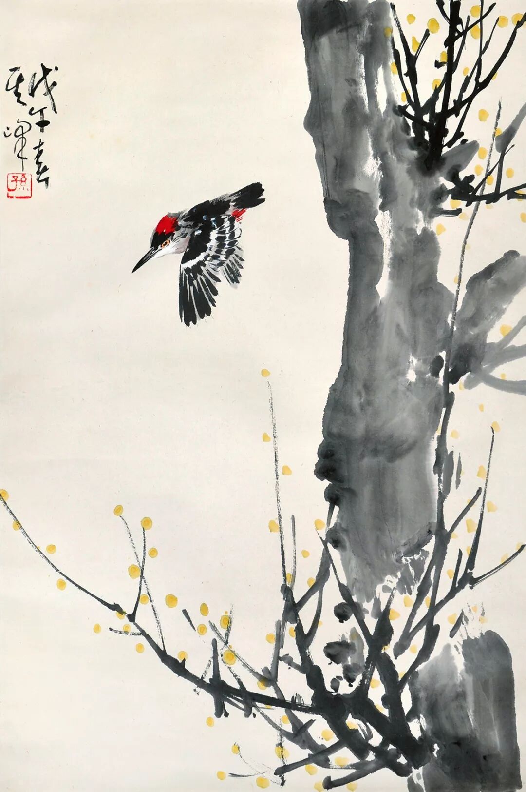 這幅作品中樹木的主幹以淡墨沒骨法寫之,樹枝從濃墨到淡墨依次寫之,濃墨處見用筆之精神,淡墨處得淡雅之趣味。稀疏的樹枝上點染數點鵝黃的樹葉,以示春意盎然。樹枝上的小鳥,似乎也意識到春天的到來,揮動著彩色的翅膀飛向遠方,在需找自己的同伴。這是孫其峰老前輩繪畫的獨到之處,讓整個畫麵有了生機,不是單單的寫景,用展翅的彩鳥喻示春的生機勃勃之態。(趙廣青)
