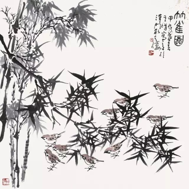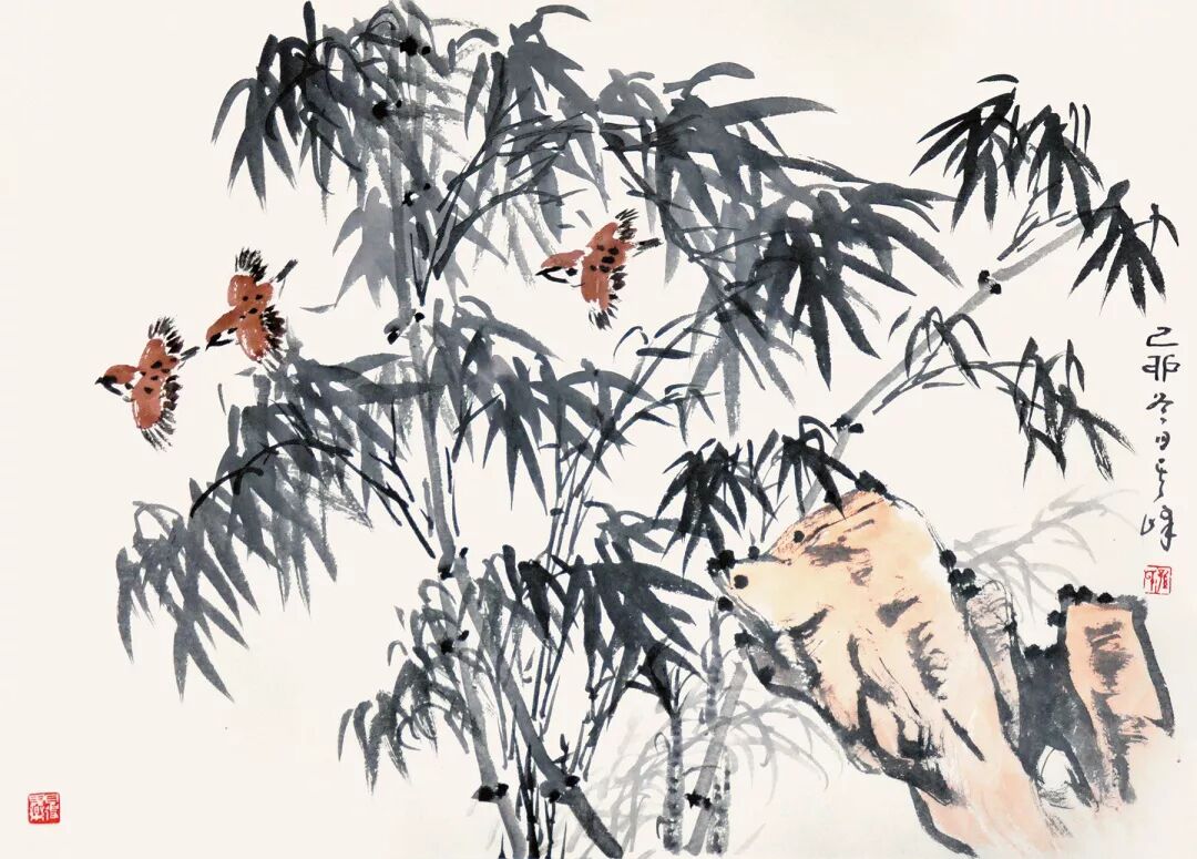 此作《竹石麻雀》圖,是藝術家最擅長的花鳥畫題材之一,竹石搭配,完美無瑕,是傳統文人畫的經典圖式之一,以象征作者清高的品格和仁者的品德。是圖中幾株翠竹占居了畫麵的中心,竹葉、竹幹皆以濃淡相宜的墨色寫就,構圖上左右開闔,張弛有度,尤其是竹葉的點染墨色層次分明,以其老辣的行草書筆意寫成,夾以飛白技法,極富自然之韻。石頭以極簡率的草書筆勢寫其輪廓,赭石點染,再以濃墨點苔其上,枯潤有致。最奇妙的是在叢竹之間點綴三隻動態不一的麻雀,更增添了畫麵的生動性,欣欣之意盎然。(曹新剛)