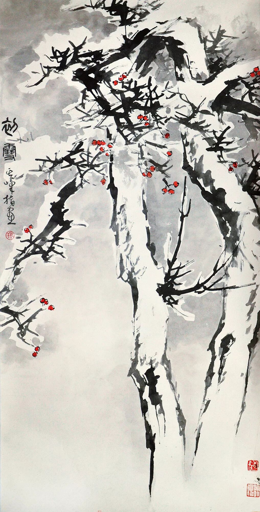 這幅作品是用手指畫法繪製的冬天的雪景,皚皚的白雪堆積在兩顆蒼勁的古鬆上麵。畫麵大片的留白以示茫茫的白雪,遠處則用淡墨加以烘托,裸露在大雪外麵的樹枝顯得格外精神,樹枝似乎看不出是手指畫的,再加上樹枝點綴的紅果,畫麵就更加別致。此時此景不得不想起陳毅一首詩:“大雪壓青鬆,青鬆挺且直。要知鬆高潔,待到雪化時”。這是讚美鬆的詩,也是襯托雪的美,更是一種意境。這件作品體現了孫其峰的繪畫特色,以墨線造型,線條的表現力極強。形體、結構、質感、動勢十分準確,不露筆墨痕跡,而能把形象表現得栩栩如生。(趙廣青)