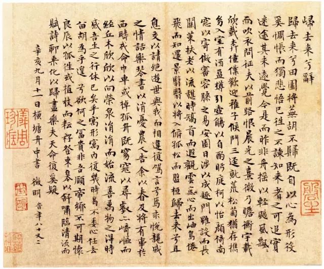 熬,是生命最好的磨石。為官三年,雖然不順利,但是,文征明並沒因此而受影響抱怨生不逢時。反而,他十分珍惜這段經曆,在其後的書法落款中常常可見“前翰林院待詔”字樣。這是多積極的人生!
