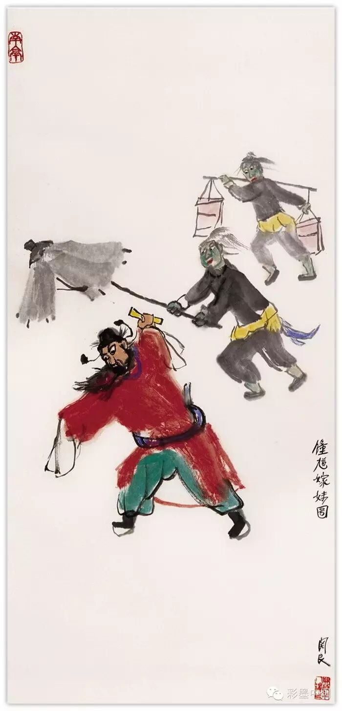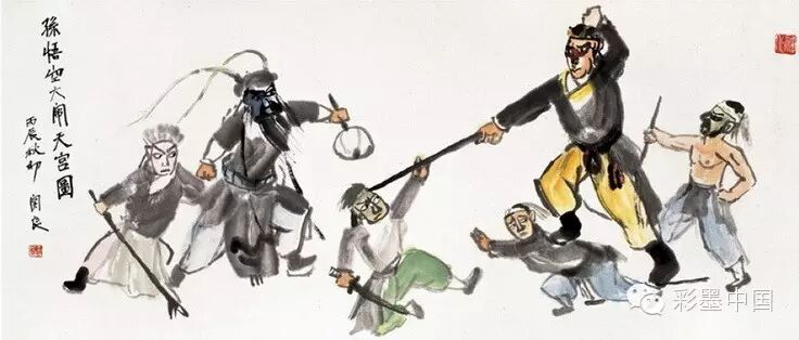 關良的畫沒有堂正之氣和飄逸之姿,卻得一“趣”字,留有孩童般的天趣和自然,常常不被外行看好,因此既入不得主流,又難得廣大民眾的喜愛。比如吧,白石老人的畫意趣盎然,雅俗共賞,最得人緣;李可染為祖國山河立傳,莊嚴深沉;潘天壽在“天行健,君子以自強不息”的一味霸悍中奪人心;傅抱石有灑脫不羈之氣,石魯有悲憤氣。——這些都是可以彪炳史冊的畫家的“硬指標”。關良的“硬指標”恰恰是這孩童氣,戲曲人物與中國畫的造型和筆墨觀如約而至,得意忘形、不似之似,其趣得 “戲”之精髓。關良對中國文化體悟之深,使他能很快登堂入室,畫中國畫之名掩了畫油畫之名,便很自然。我之所以言及畫種的跨越,是因為由油畫轉習中國畫的,不在少數,甚至成了潮流,但其中成功者卻寥寥。所以,關良之才,重在融通。在東方與西方、民間與文人、學院與素人、謹嚴與隨意之間取得了融會貫通。