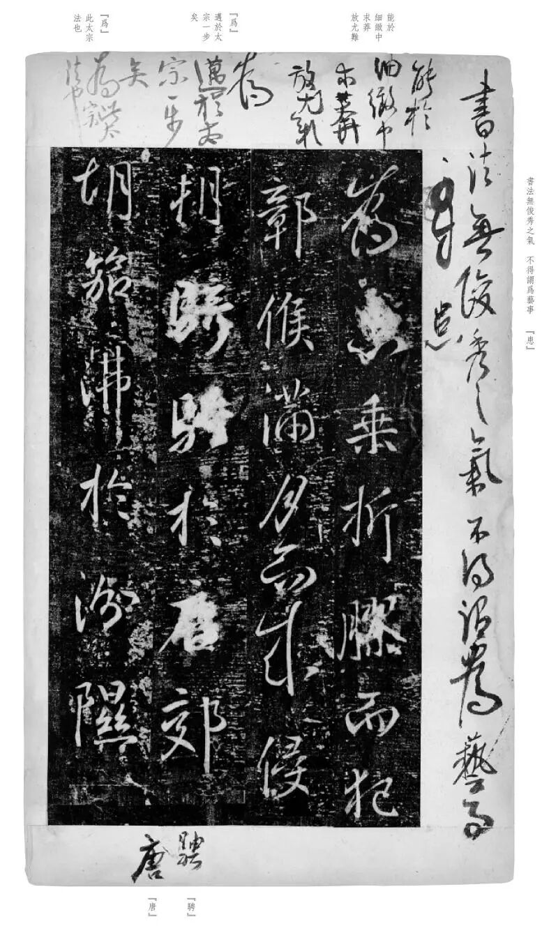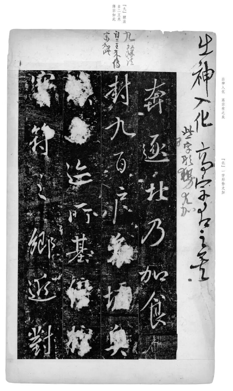 由 “(九)隸法 自二王來傳宗如此(老)晉人法也,從隸來。(定)王法於今未改(九)篆法” 批注數條可知,高先生在讀帖臨摹的過程中,不僅細心研讀每個字的形質、神采等書法本體要素,在縱向上還考其由來,從文字書體的演變上探其原委,知其然,知其所以然。與此同時,橫向上則以不同書家進行比較,使得各自的書風特點更加清晰明了。如:“高宗行草大似晉賢風格,其綿中裹鐵之勢,絕可慕愛。文皇多剛,天皇格多柔,此兩言決耳。”,“《貞武》可與文皇之《溫泉銘》合參。”“高宗字法,(點)尤厚重出神入化,高宗有之矣。”。