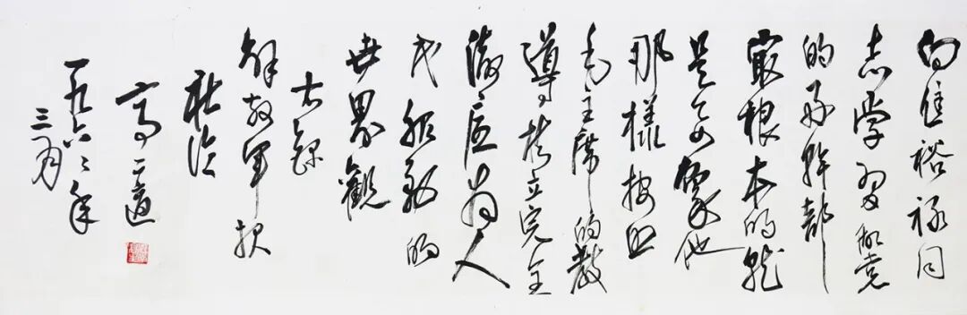 羅曼·羅蘭曾說:“沒有偉大的品格,就沒有偉大的人,甚至也沒有偉大的藝術家,偉大的行動者。”因此,當今書法界需要高二適!更需要二適精神!他是詩人,是學者、是富有才情的書法大師,更是對狂草一體有曆史性創造的當代草聖,時代更需要的是他的精神魅力,一種卓然獨立的人格氣象和風骨,似一座燈塔照亮前行的路,感召後學,讓當代書家撥開迷霧,看清人文之道,不斷續寫新的篇章。