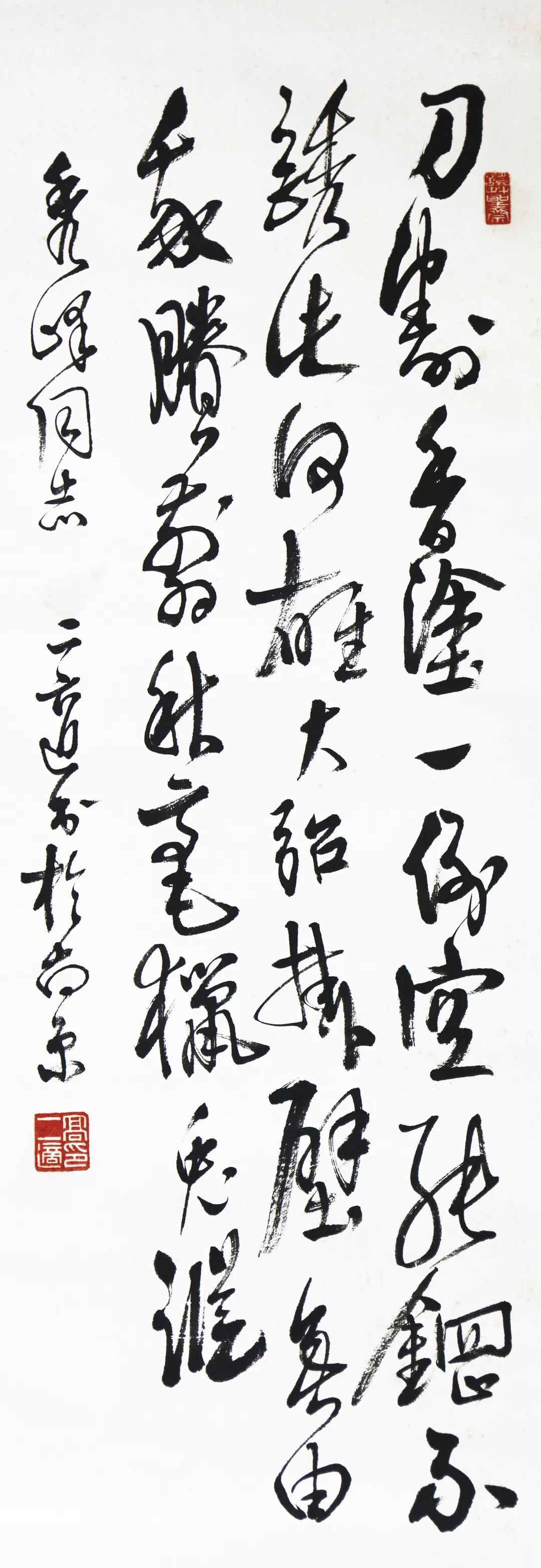 當我們靜靜地凝視高二適先生的書法遺墨,那靈異的墨線,似高猿悲叫,亂水潛奔,這是流淌在古典詩文和經典碑帖中的心靈對晤,是意與古會的神異契合,是文化徜徉裏的淺唱低吟,似高山流水般沁人心脾。在筆力彌滿、意態天矯,行氣淋漓的筆勢中透映出一位傳統文人的自我風神。從“赴速急就稱奇觚,鬼哭神驚運思初”的詩句裏,流露出他作書時“筆所未到氣已吐”的豪邁心象。高二適先生的書法意象以氣勢開張、書蘊“詩意”為基調,以其精湛的筆墨古法、深厚淵深的文史修養和特立高潔的文人風骨幻化熔鑄,開古典主義之新境,堪稱傳統書法草書一脈的浪漫主義大師!