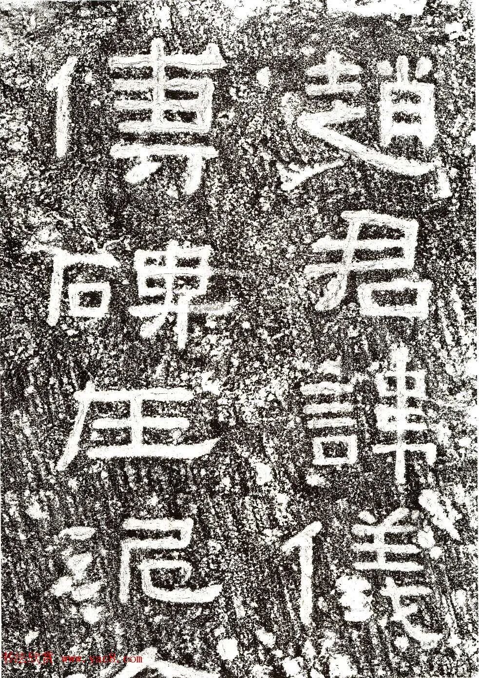 《趙儀碑》書法風格方峻樸率,嚴整古穆,用筆以方為主,點畫精密而流美,結字方整而典雅,章法上也是橫無行、縱有列,字體之大小、長短參差錯落,但字與字之間皆有一定留白,整體上顯得疏落散逸,率意質樸,然以其文多訛字,當是不諳六書的民間書手所為,也正因為此,反而使該碑於平淡之中透露出一股自由不拘、瀟灑隨意的自然韻致。