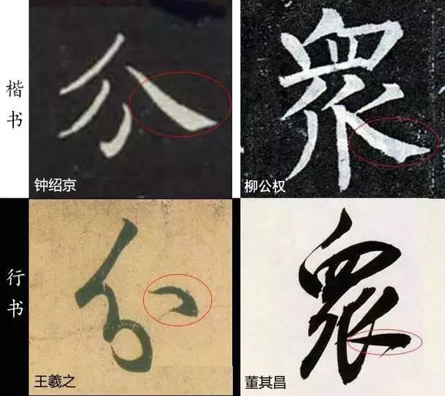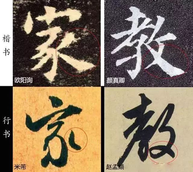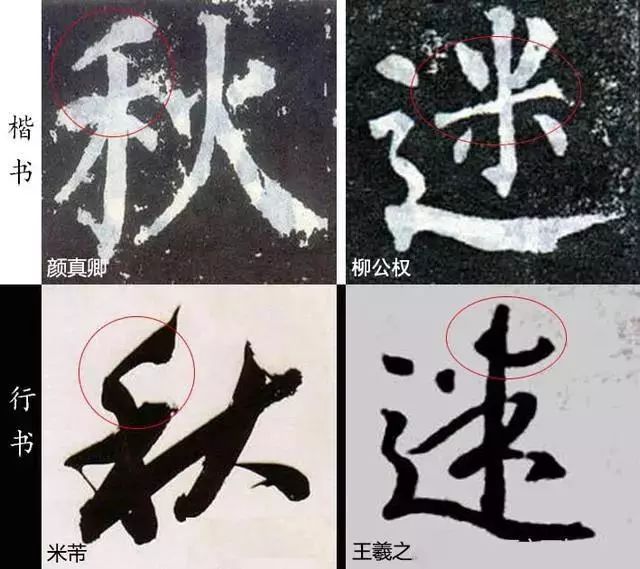 在筆畫的轉折處,楷書用的是方折,著眼書寫便捷流暢,行書多用彈性十足的圓轉。