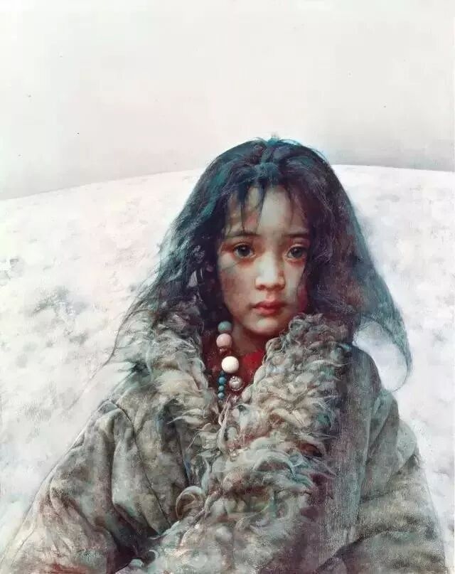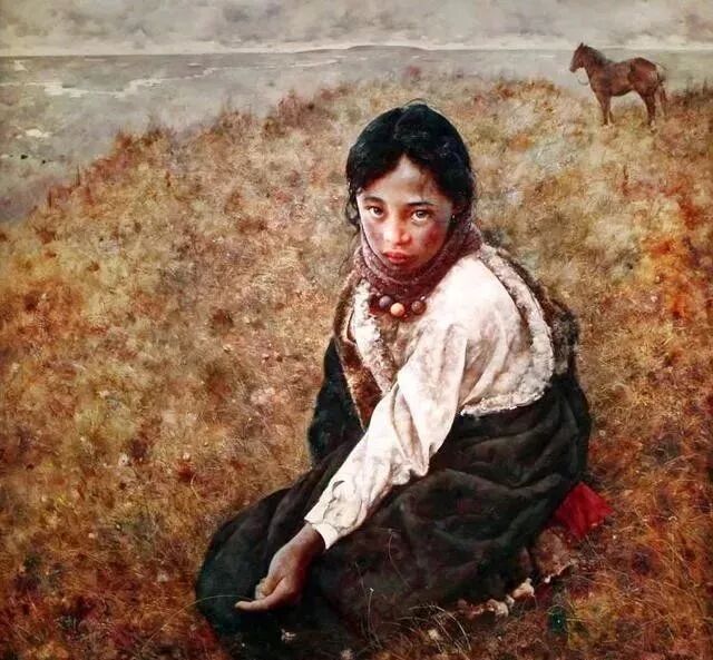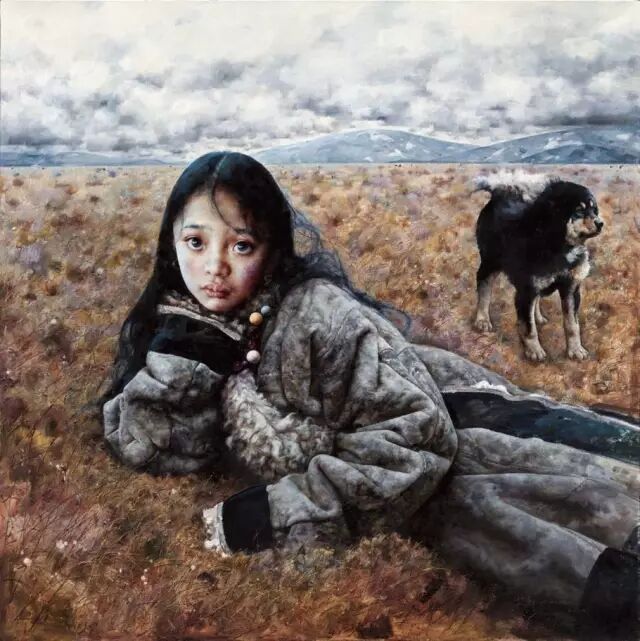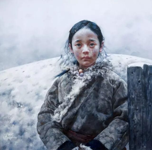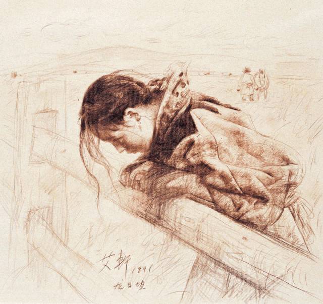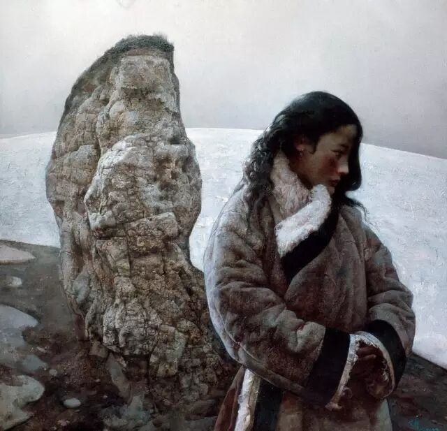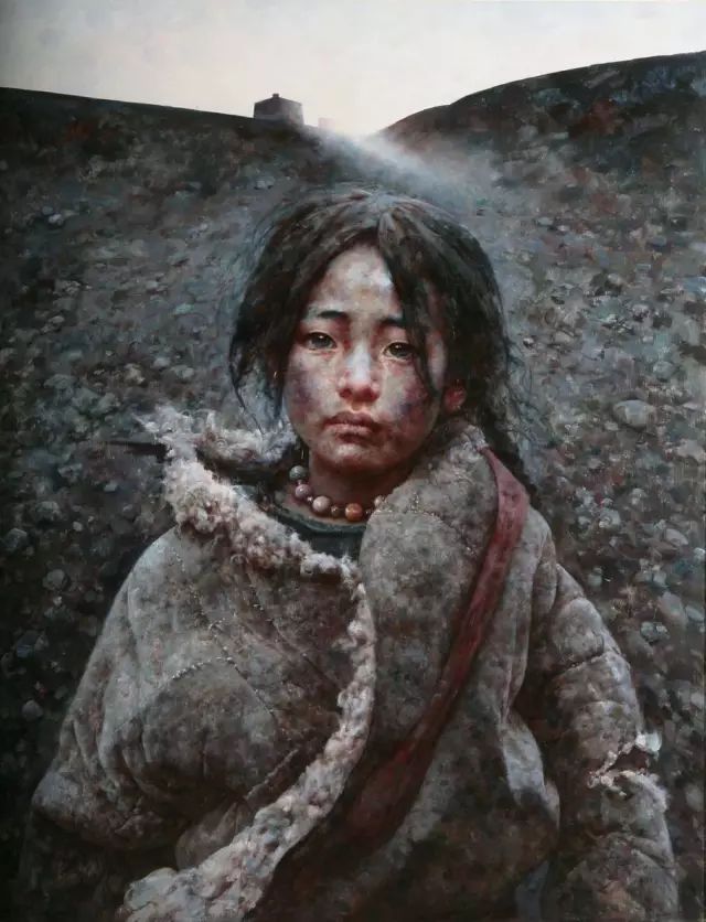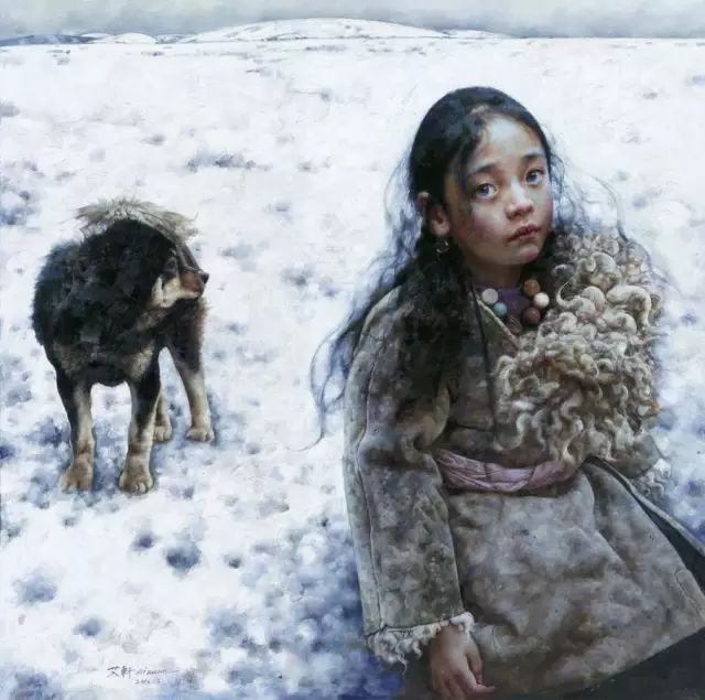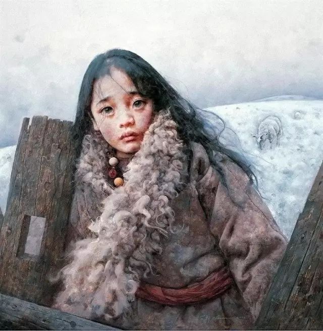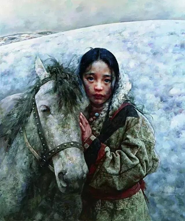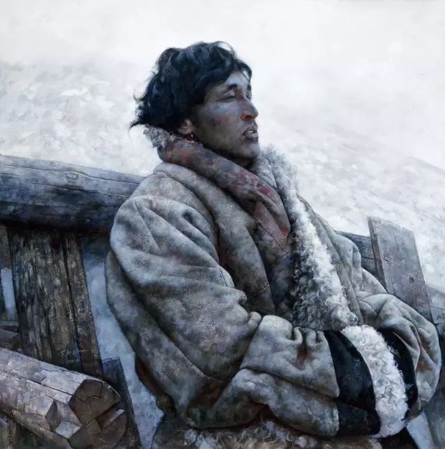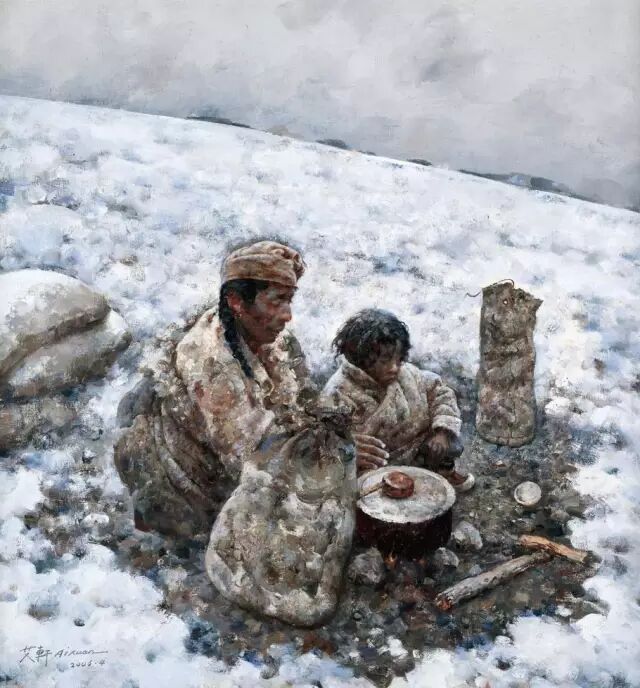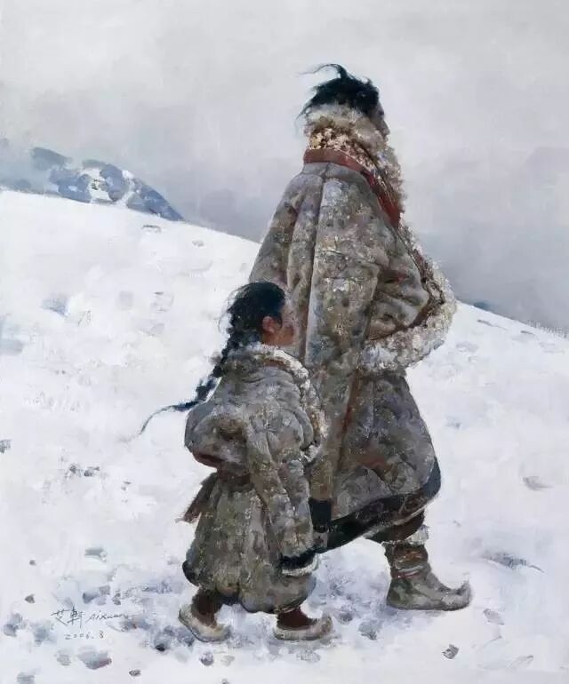 獨自一人在一望無際的草地、雪野、荒原,他(她)們的生活以及大自然,似乎皆要避開觀眾的視線。在極少的情況之下麵對觀眾的形象(如《凍土帶》)也用冷漠和陌生的眼光,靜觀這與他(她)們有隔閡的世界。艾軒在寫實的物象中寄托了自己的思緒和感情,他用借景寫情的方法,創造出一幅幅情景交融的、有意境的畫麵。