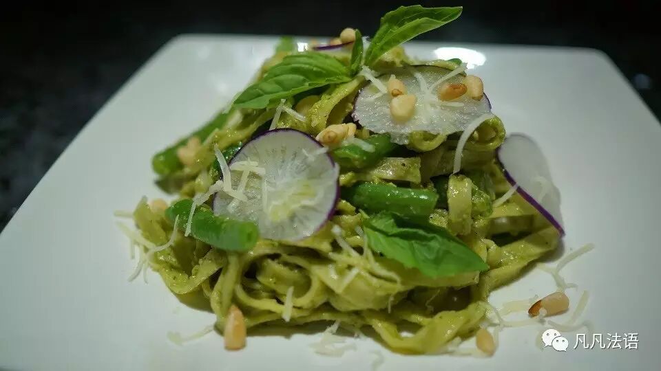 青醬做好後,就是煮麵。鍋要大,水要多,保證麵能在鍋裏自由地舞蹈,水燒開後,放入新鮮的“菲塔契尼”,再放入一勺鹽,煮五分鍾左右,撈出麵條,瀝幹水分,拌入意大利青醬,撒上點鬆子,羅勒葉,和帕瑪森奶酪。Voilà!