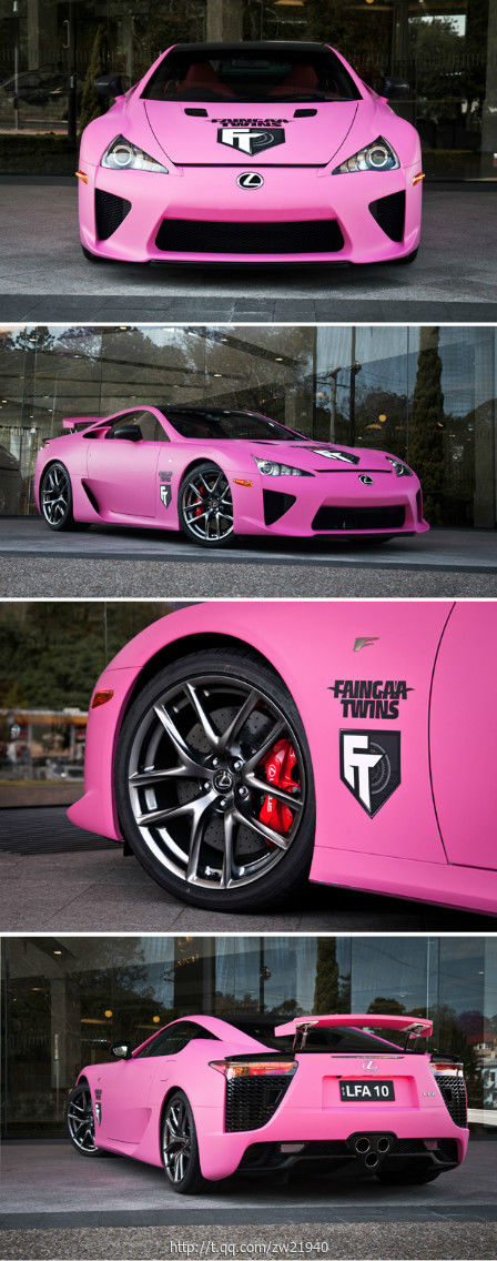 【粉紅色雷克薩斯LFA】#隨手拍豪車#網圖。為支持乳腺癌宣傳月,澳大利亞的布裏斯班雷克薩斯經銷商把一輛價值700,000$雷克薩斯LFA塗裝成粉紅色,用來支持此次乳腺癌的宣傳活動。搭載的是4.8L V10發動機,最大馬力為562hp,0-100 km / h加速僅3.7秒,極速為325km/h。