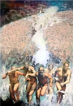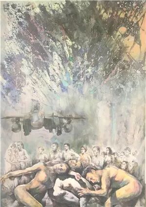 在名為《民眾之勇》(Volkswagnis)的畫麵中,以卡爾·馬克思為首的一群人,仿佛覆蓋了整個地球,正被一股洪流追趕著,裹挾著,向著畫外狂奔。而在另一幅畫《接納站點》(Auffanglager)中,一群在轟炸機機翼下充滿恐懼的人,無助而疲軟地相互攙扶著、俯臥著,讓人不由地聯想到,在隨時就會爆發戰爭的世界裏,誰能保證,下一個難民不會就是我們自己呢?