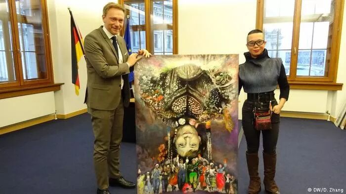 畫像上麵帶微笑的女人是德國總理默克爾嗎?中國人從姿勢和穿著上也會發現慈禧的影子。目前這幅畫掛在德國自民黨主席林德納爾的辦公室裏。專欄作者張丹紅目睹了畫像的“交接儀式”。