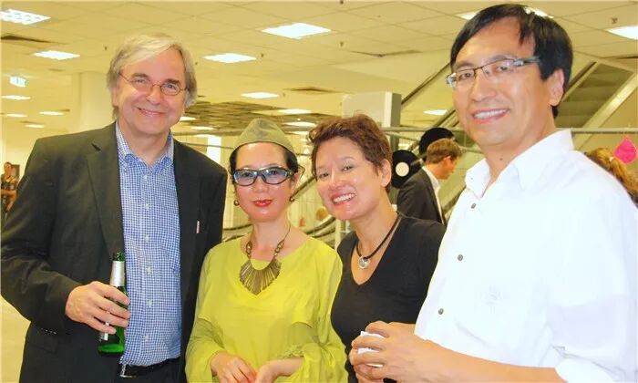 2011年8月26日,藍鏡在Wiesbaden舉辦的行為藝術“啊踢死他”上。左起:時任Wiesbaden市長的Helmut Müller、藍鏡、策展人徐娟和德國《華商報》總編修海濤