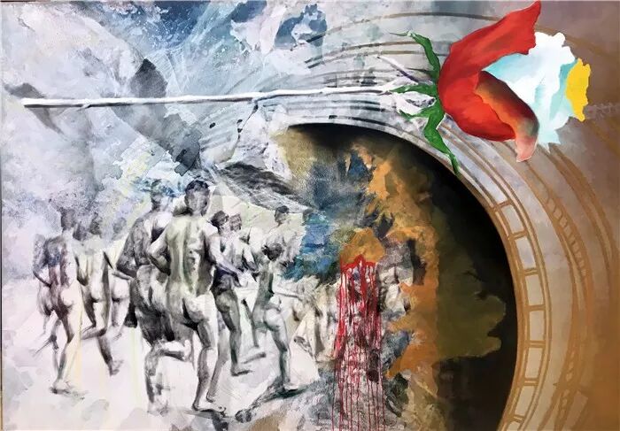 作品《帝舵玫瑰》(Tudor Rose)描繪了一群向著隧道深處急速奔跑的背影,那些裸奔著的背影,一部分人的臉部卻朝向觀眾,猶如一群被扭轉了頭顱的人,身首相反,行動怪異。隧道上方一支象征著英國的三色玫瑰成了畫麵的聚焦之處,讓人自然地聯想到脫歐的英國民眾,一邊不由自主在脫離歐盟的道路上漸行漸遠,一邊又不斷回望歐洲大陸,其矛盾糾結的心態躍然畫麵。而畫麵中的人物臉部,正是畫展上一些誌願參與“行為藝術”的觀眾肖像。
