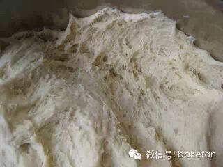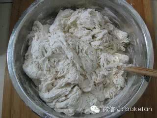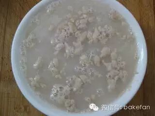 等水中的酵母變成小泡漂起來,全部倒進麵粉中,慢慢攪成絮狀。