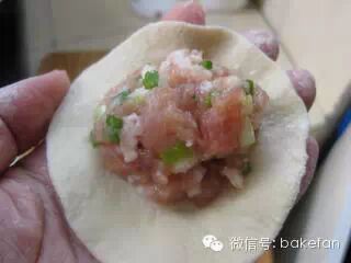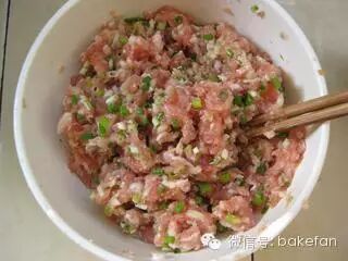 肉餡裏調入薑末、鹽、料酒、白糖、生抽、胡椒粉、蠔油、雞精拌勻,分三次往裏加入清水,朝一個方向攪拌上勁,這樣肉餡會非常鮮嫩,倒進蔥花,拌入少許香油。