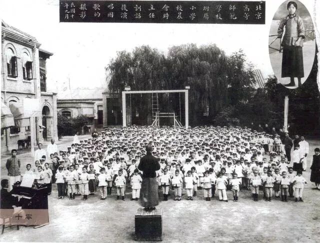 △ 1920年9月北京高等師範學校附屬小學晨會時,學生演唱國歌,右上角穿黑色套裙者為鄧穎超老師,時年18歲。