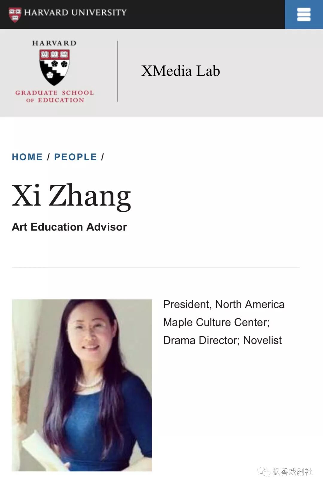 近日,北美楓香文化中心董事長、旅美作家張西受聘成為哈佛大學教育學院XMedia實驗室戲劇藝術教育導師。