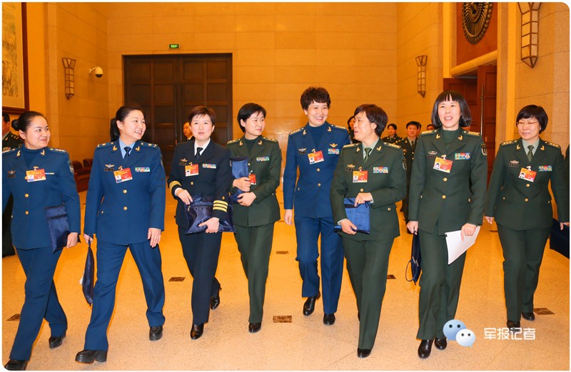 2015年3月7日,解放軍代表團第一次大會結束後,女代表們走出會場。“空軍女傑”(正師28年,空軍大校軍銜)與“飛天神女”二劉肩並肩。