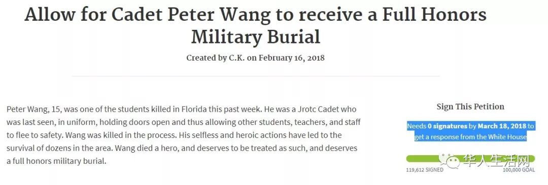 民眾在白宮請願網上,以軍禮安葬王孟傑,迅速破10萬人,在沒有滿10萬前,白宮就已特許為小英雄王孟傑,以軍禮將其安葬。