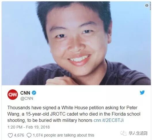 美國華人15 歲的小英雄 Peter Wang 在 2月14日佛羅裏達州 ParkLand 高中的Nicolas Cruz 的血腥屠殺中為了拯救同學們英勇獻出年輕生命,Peter wang 出生在紐約布魯克林八大道,父母來自福建省福州市連江縣琯頭鎮山兜村。