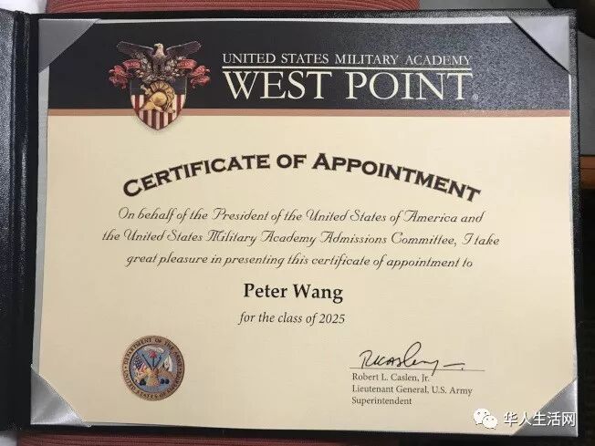 美國西點軍校追授王孟傑錄取通知書。王孟傑曾經夢想入讀這所著名學府。