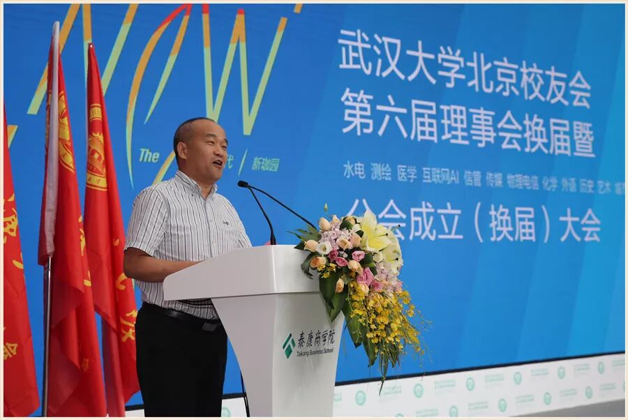田源校友代表全球各地地方校友會發言,表達了對北京校友會的祝福,希望全球校友一起努力,發出自己的光,努力將武大建設成一所偉大的大學。