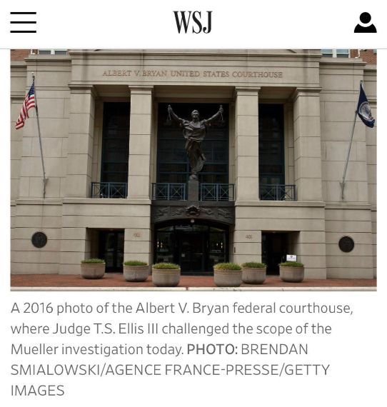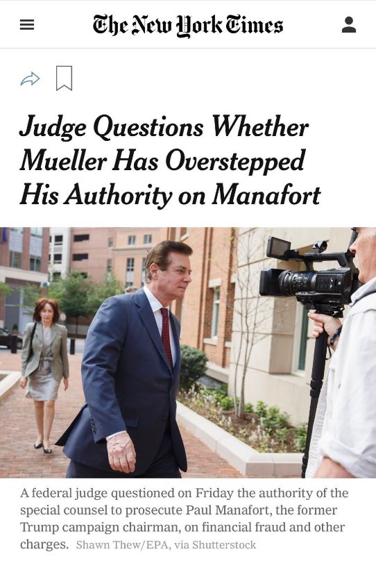 《紐約時報》報道聯邦法院法官質疑特別檢察官穆勒是否有權利起訴馬納福特的銀行和稅務欺詐罪。
