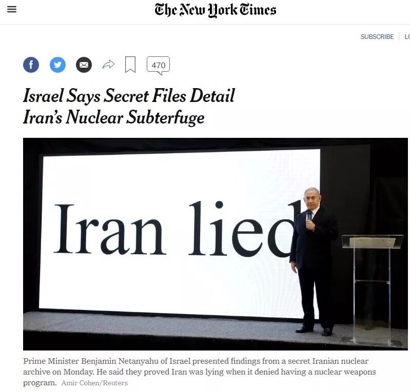 以色列總理內塔尼亞胡在新聞發布會上說:“伊朗撒謊了”。(《紐約時報》截屏)