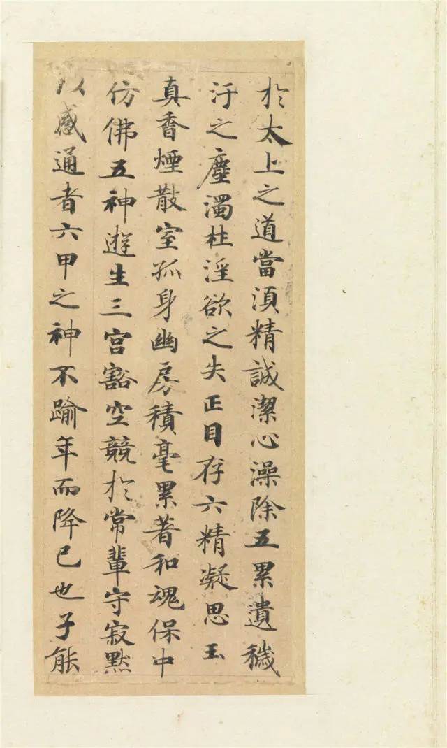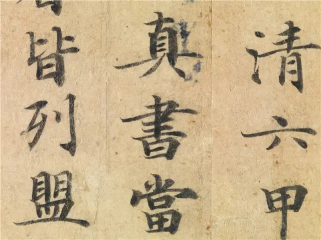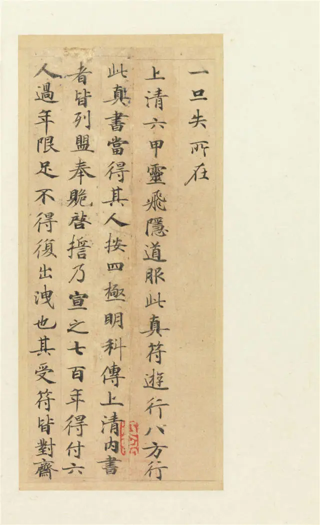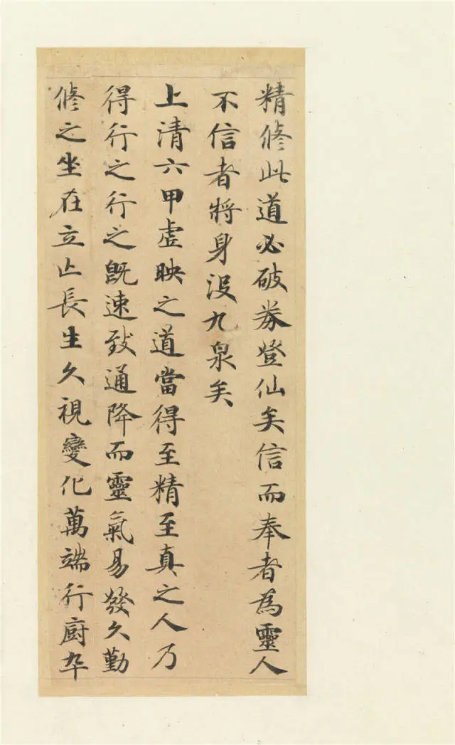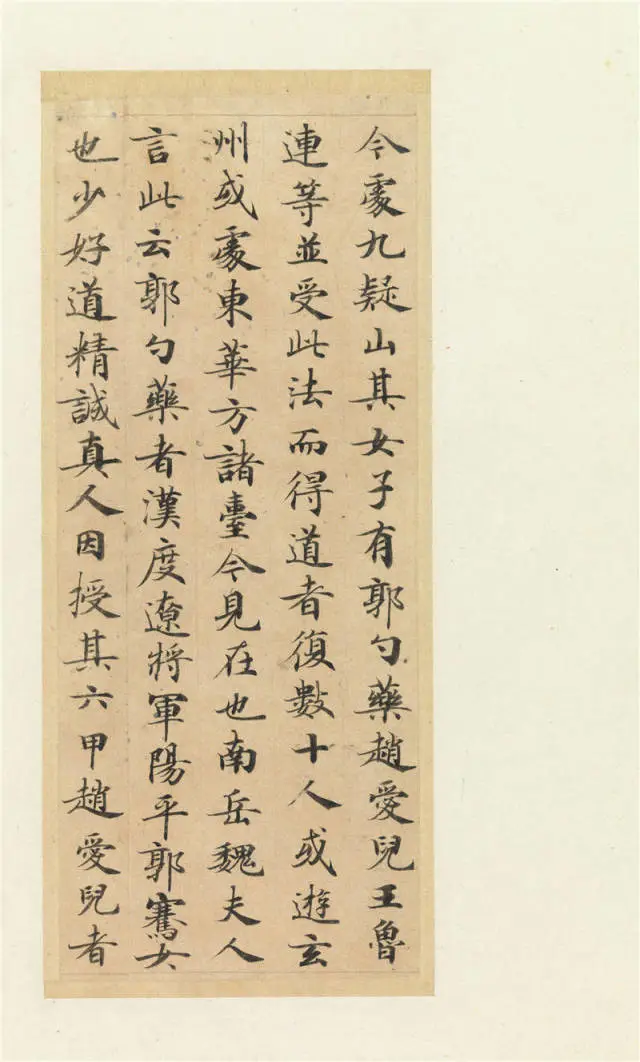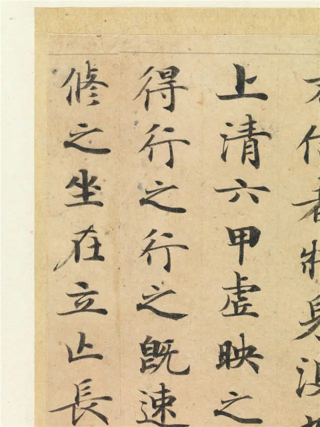 《靈飛六甲經》是一卷道教的經,在明代晚期,發現一卷唐代開元年間精寫本,它的字跡風格和磚塔銘一派非常相近,但毫鋒墨彩卻遠非石刻所能媲美。當時流入董其昌手,有他的題跋。海寧陳氏刻 《渤海藏真》叢帖,由董家借到,摹刻入石,兩家似有抵押手續。後來董氏又贖歸轉賣,鬧了許多往返糾紛。《渤海》摹刻全卷時,脫落了十二行,董氏贖回時,陳氏扣留了四十三行。從這種抽頁扣留的情況看,脫刻十二行也可能是初次抵押時被董氏扣留的,後來又合又分,現在隻存陳氏所抽扣的四十三行,其餘部分已不知存佚了。