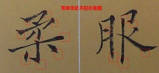 從學書的進程來說,初學者一開始就應努力練習立鋒的本領,盡量以鋒端運使。練到筆鋒什麽情況下都能彈起來的程度,則無論筆鋒,筆腰、筆根、筆側,無不能力透紙背,就如武功高強之人,無論拳、肘、肩、臂,全身各處,無一不能發力傷敵。