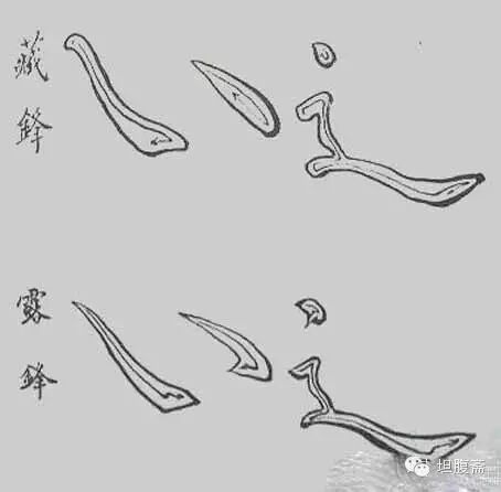 以上所引都是關於藏鋒的論述。破解了他們的話,什麽是藏鋒的真諦自然也就明白了。我們先析王說。王說中的“滅跡隱端”當是對“存筋藏鋒的注解”。關於“滅跡”孫過庭有句“一點之內變起伏於鋒稍;一畫之內措於毫芒”語。是對書寫時筆鋒動作的描摹。王說中的“滅跡”泯滅的就是鋒稍的這種“起伏”,“