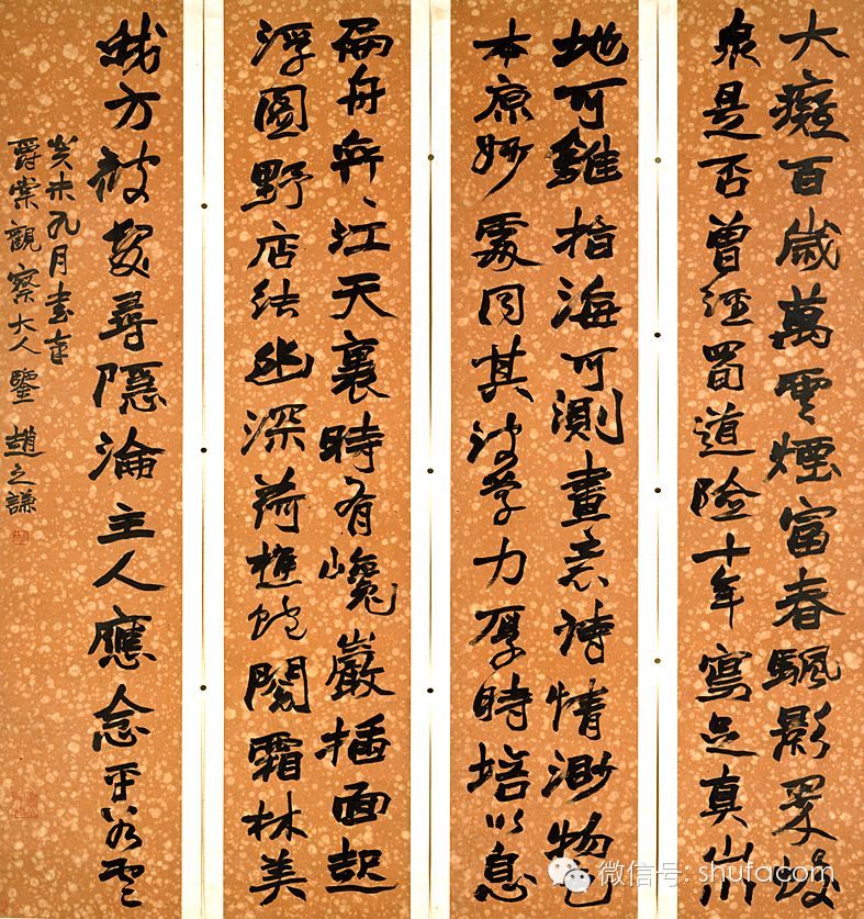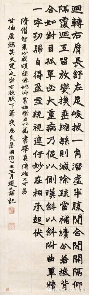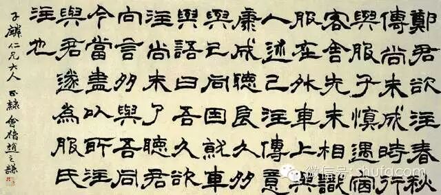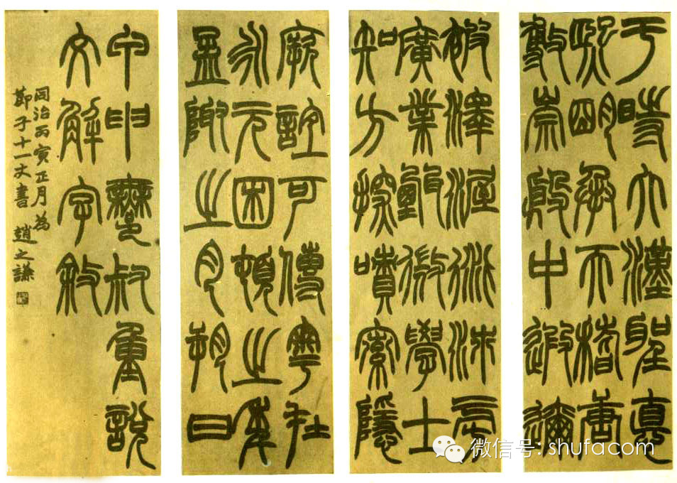 趙之謙精通於書畫篆刻,他的書風屬於鄧完白、包慎伯、吳讓之一路,由包氏的執筆法學習北碑。他的篆隸有他獨特的光芒。他的天分獨厚,而又夠加以發揚光大,所以產生出極富現代氣息的作品。