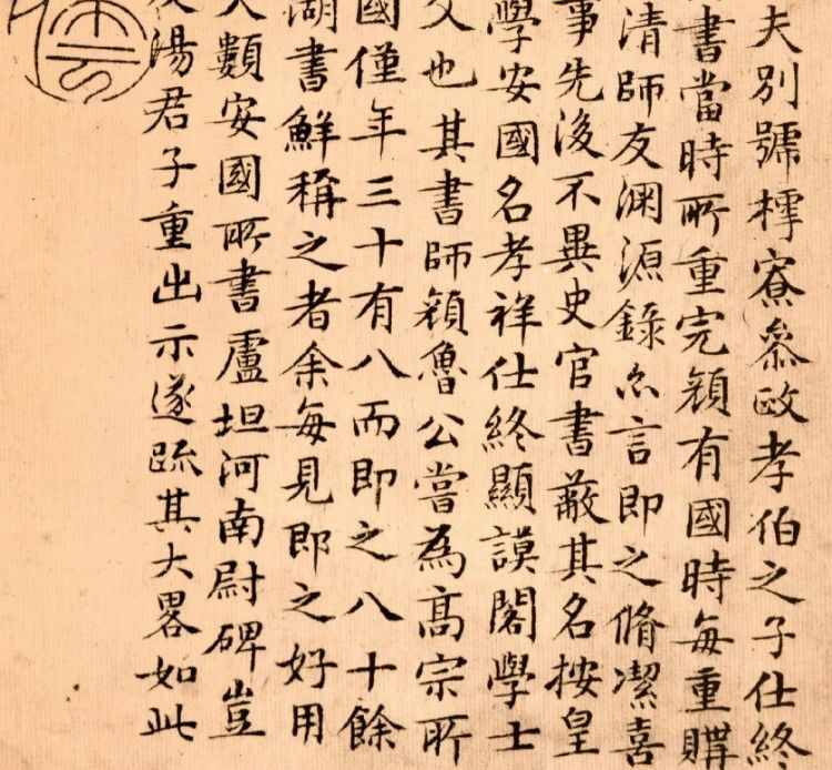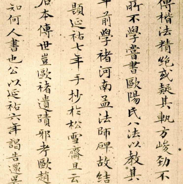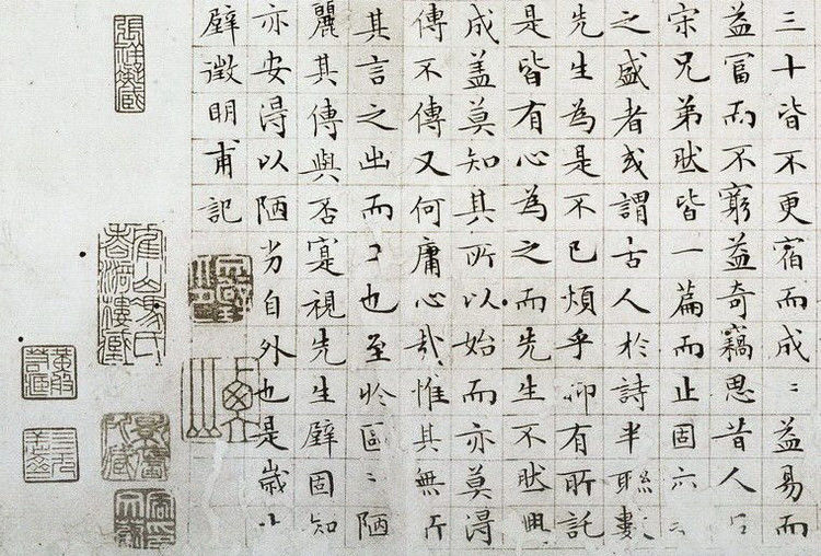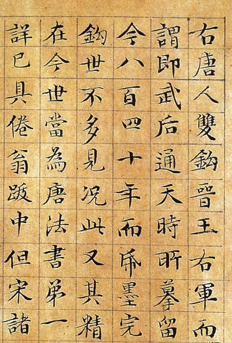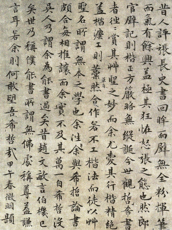 3.古無真正楷書,即鍾、衛所傳《薦季直表》、《樂毅論》,皆帶行筆,自唐《九成宮》、《多寶塔》等碑,始字畫謹嚴,而偏肥偏瘦之病,猶然不免。至國朝文征仲先生始極意結構,疏密勻稱,位置適宜。如八麵觀音,色相俱足。於書苑中亦蓋代之一人也。