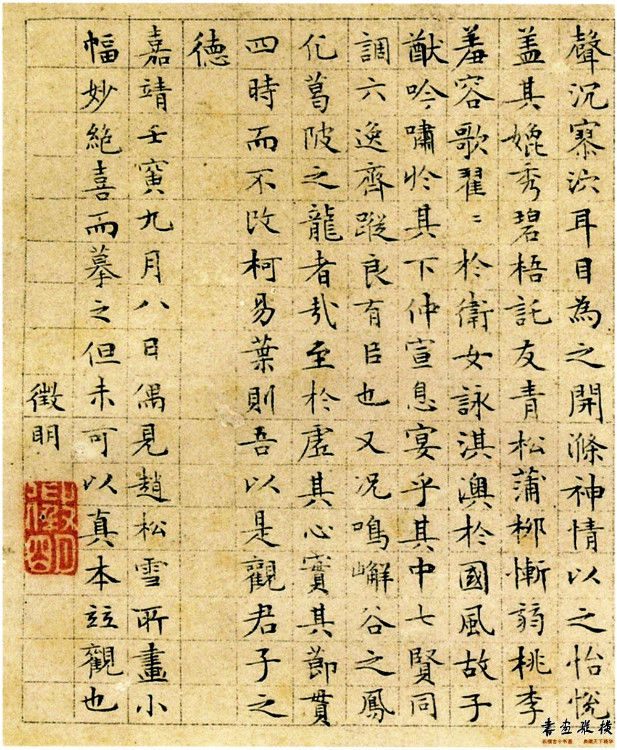 2.文徵明以兼善諸體聞名,尤擅小楷和行書。他的小楷師承晉唐各家,主要學於鍾繇、王羲之、王獻之、虞世南、褚遂良、歐陽詢等,不僅精細工整、法度嚴謹純熟,且筆鋒勁秀、風格俊雅。至八十歲後的小楷尤見功力。