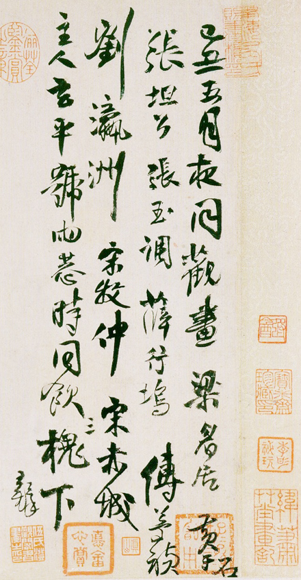 王鐸的成功就是將“二王”一路筆法做了各方麵的調整,使線條蒼勁剛毅而富有彈性,有“錐畫沙”、“印印泥”之妙。譬如此卷中“蟬聲”二字,通過提按以及運筆的疾遲控製,使其最終形態顯得骨氣洞達、風神瀟灑。