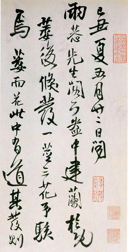 王鐸書法帶給欣賞者的審美感受是多層次的。與其他藝術門類的表現方式相比較,書法運用黑、白兩色來進行創作,顯得有些單調。然而,也正由於這純粹的色彩構成使其成為經典。王鐸的睿智,同時也表現在對黑白色階的布排技巧方麵。他把水墨玩得如此徹底、如此成功!以此卷為例,“蟬聲集古”四字“潤含春雨”,“寺鳥影渡寒”五字則“幹裂秋風”。
