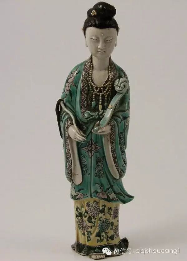 14 、 罐類:將軍罐,始見明代嘉靖,康熙朝延續順治式樣,高矮大小不等。官民窯均有,但民窯所占數量多,早期口大罐高,晚期口小罐矮。常畫仕女嬰戲、洞石花鳥兩 種圖案,往往底部無釉露胎,胎體厚重,足邊有火石紅,官窯產品尺寸小,常在腹部繪團壽紋,底部圈足滿釉書有本朝 6 字款。蓮子罐、瓜罐、冰梅罐、竹節蓋罐,罐身繪翠竹紋,除青花外,還有白釉綠彩。鼓式蓋罐、獅鈕蓋罐、粥罐,為康熙朝創新式樣,多是民窯產品,尺寸不是很 大,形體矮而圓,底部無釉露胎,肩部有對稱雙圓孔,穿有銅環,便於提用。罐蓋分圓頂和平頂兩種,前者多置寶珠形鈕,後者無鈕。
