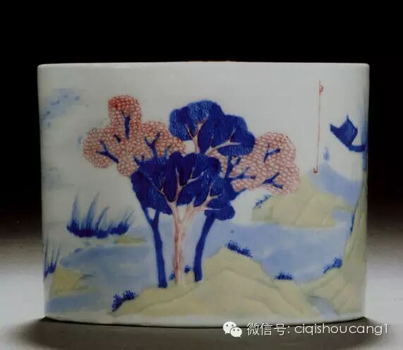 17 、 筆筒類:文房用具之一,數量很多,器壁多較厚。較明末清初有了明顯的變化,流行口底相若的圓筒形,數量最多的也是最具代表性。另有撇口形、竹節式、束腰式 等,束腰式多出現在早期,有的口部施漿白釉,已不是主流品種。最常見的是玉璧形底,底心出臍微向內凹,有釉,比外壁釉要偏白、薄,臍內的外圍有施釉和無釉 兩種,後者居多。其次是台階底,圈足和平底無釉露胎。也有的是底部有三個條形小足。官窯筆筒多書長篇詩文,詩尾常用釉裏紅篆書“康熙傳古”方章。民窯釉麵 泛青,多畫山水人物故事和花鳥圖。個別帶有紀年如康熙二十年山水人物筆筒、康熙十三年山水筆筒等,這類帶紀年的民窯筆筒,總體特別是胎厚重,底無釉,口沿 與近底處往往有暗刻雙弦紋或卷草紋,而這種暗花邊飾在明末崇禎和清初青花瓷中非常流行,如筆筒、蓮子罐和筒式瓶中經常看到。