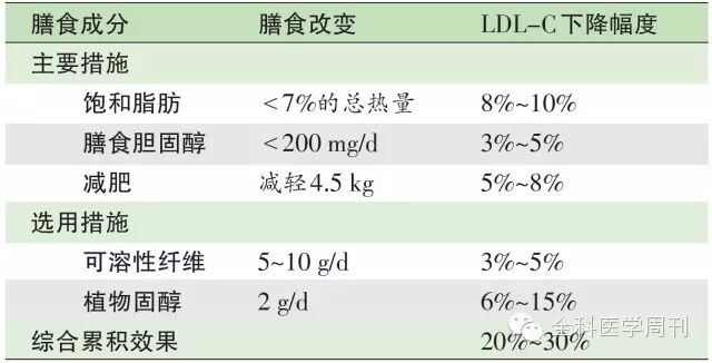 TLC的主要內容包括:①膳食幹預,重點是減少飽和脂肪酸和膽固醇的攝入量(表1);②選擇能夠降低LDL-C的食物(例如植物固醇和可溶性纖維);③減輕體重;④增加有規律的體力活動;⑤采取針對其他心血管危險因素的措施,例如戒煙、限鹽、節製飲酒量和降低血壓等。前4項措施均能夠起到降低LDL-C的作用(表2),在控製血脂的同時還可以減少心血管病事件的發生。