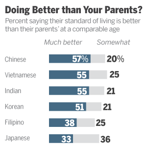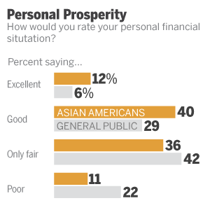 6)至於對自己目前經濟狀況和職業前景的滿意度,跟美國大眾比起來,亞裔自我感覺更好。